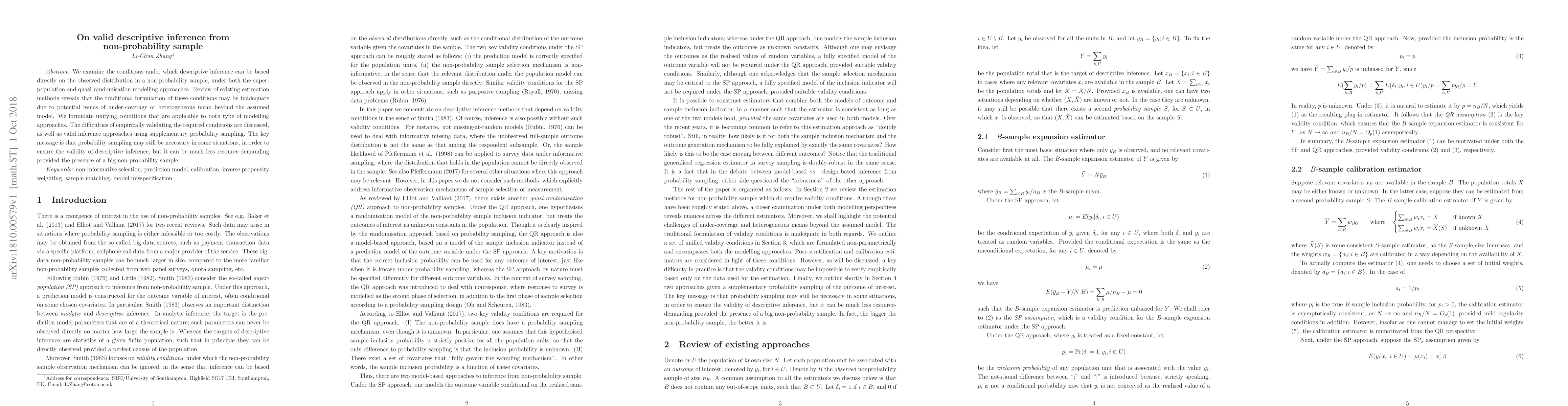 We examine the conditions under which descriptive inference can be based directly on the observed distribution in a non-probability sample, under both the super-population and quasi-randomisation modelling approaches. Review of existing estimation methods reveals that the traditional formulation of these conditions may be inadequate due to potential issues of under-coverage or heterogeneous mean beyond the assumed model. We formulate unifying conditions that are applicable to both type of modelling approaches. The difficulties of empirically validating the required conditions are discussed, as well as valid inference approaches using supplementary probability sampling. The key message is that probability sampling may still be necessary in some situations, in order to ensure the validity of descriptive inference, but it can be much less resource-demanding provided the presence of a big non-probability sample.
