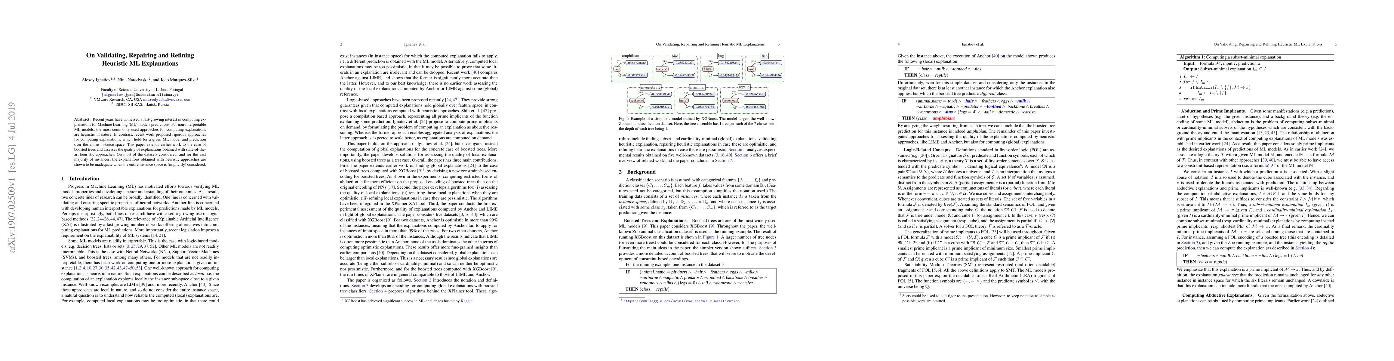 The paper proposes an abduction-based approach, XPlainer, for validating, repairing, and refining heuristic explanations for Machine Learning (ML) models, specifically focusing on boosted trees. It extends earlier work to assess the quality of explanations provided by state-of-the-art heuristic approaches like LIME and Anchor.