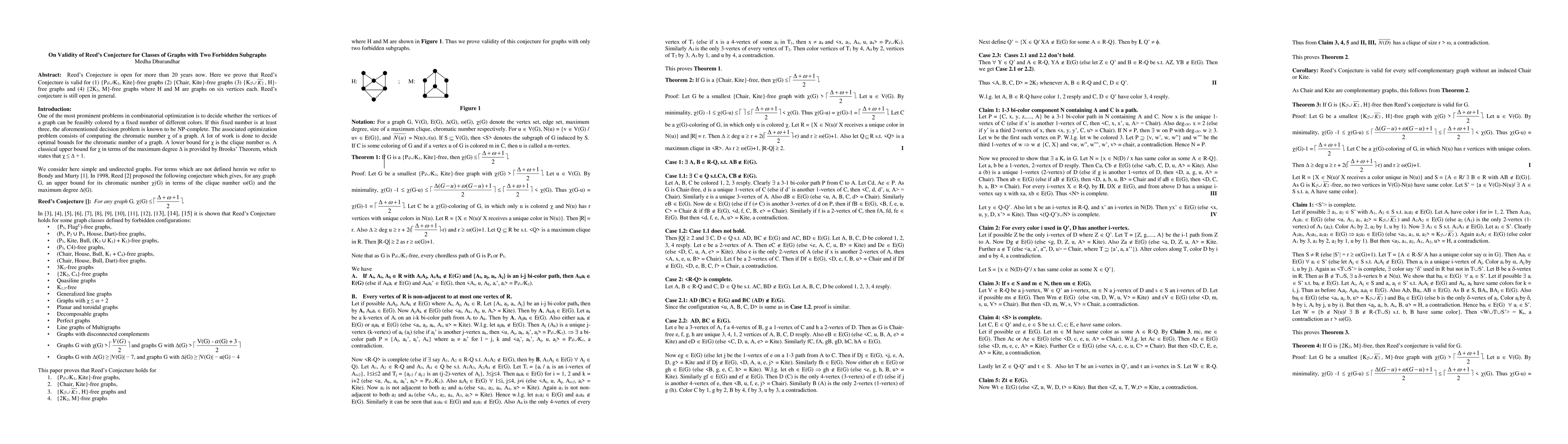 This paper proves the validity of the Reed Conjecture for several classes of graphs defined by two forbidden subgraphs, including {P4UnionK1, Kite}-free graphs, {Chair, Kite}-free graphs, {K2UnionK2complement, H}-free graphs, and {2K2, M}-free graphs. The conjecture remains unresolved in general.