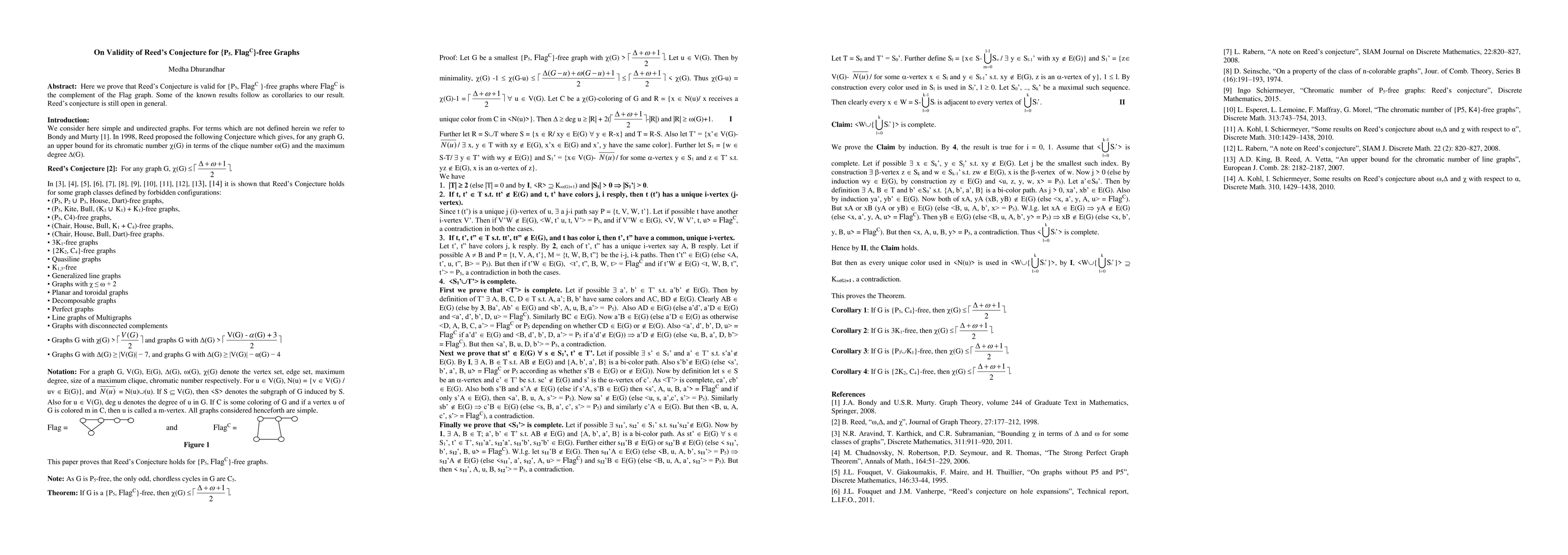 The paper proves that Reed Conjecture is valid for {P_5, Flag^C}-free graphs, a specific class of graphs, with implications for related open problems in graph theory.