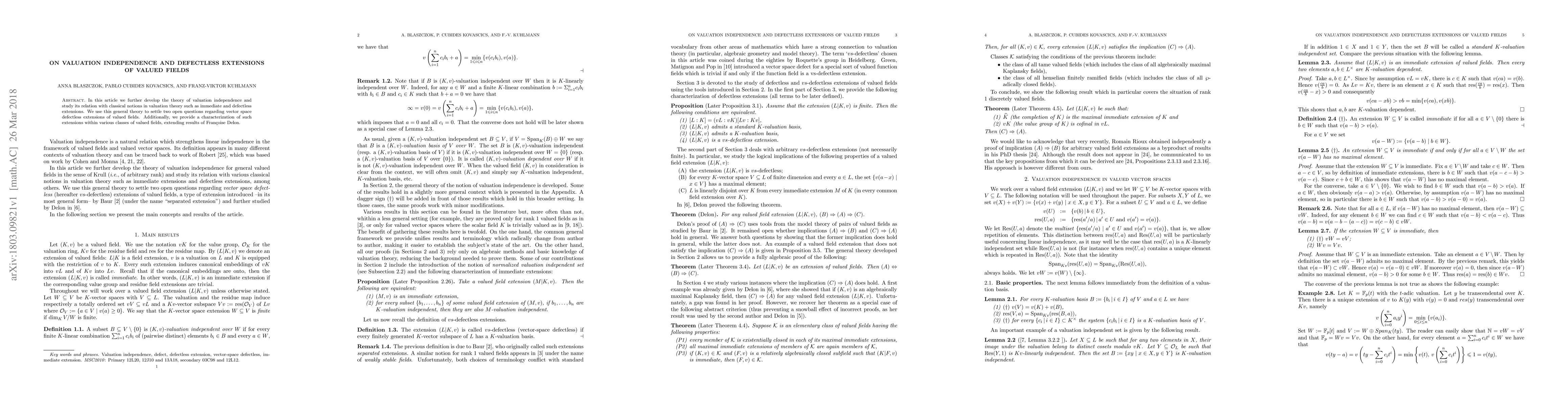 This paper develops the theory of valuation independence and explores its connections to immediate and defectless extensions in valuation theory. It resolves two open questions about vector space defectless extensions of valued fields and characterizes these extensions across different classes of valued fields, building on Françoise Delon's work.