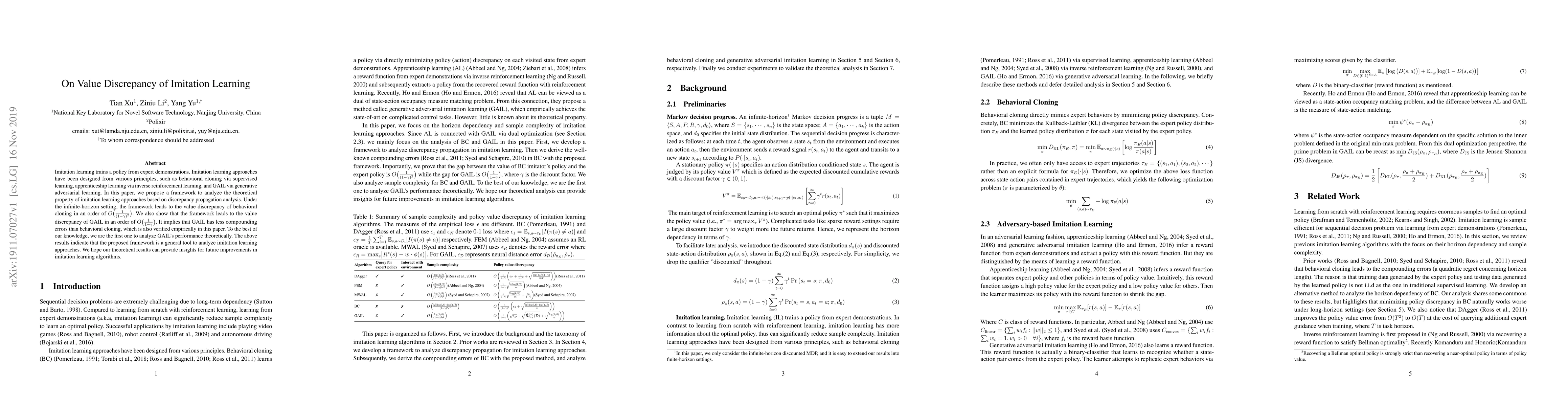 Imitation learning trains a policy from expert demonstrations. Imitation learning approaches have been designed from various principles, such as behavioral cloning via supervised learning, apprenticeship learning via inverse reinforcement learning, and GAIL via generative adversarial learning. In this paper, we propose a framework to analyze the theoretical property of imitation learning approaches based on discrepancy propagation analysis. Under the infinite-horizon setting, the framework leads to the value discrepancy of behavioral cloning in an order of O((1-\gamma)^{-2}). We also show that the framework leads to the value discrepancy of GAIL in an order of O((1-\gamma)^{-1}). It implies that GAIL has less compounding errors than behavioral cloning, which is also verified empirically in this paper. To the best of our knowledge, we are the first one to analyze GAIL's performance theoretically. The above results indicate that the proposed framework is a general tool to analyze imitation learning approaches. We hope our theoretical results can provide insights for future improvements in imitation learning algorithms.
