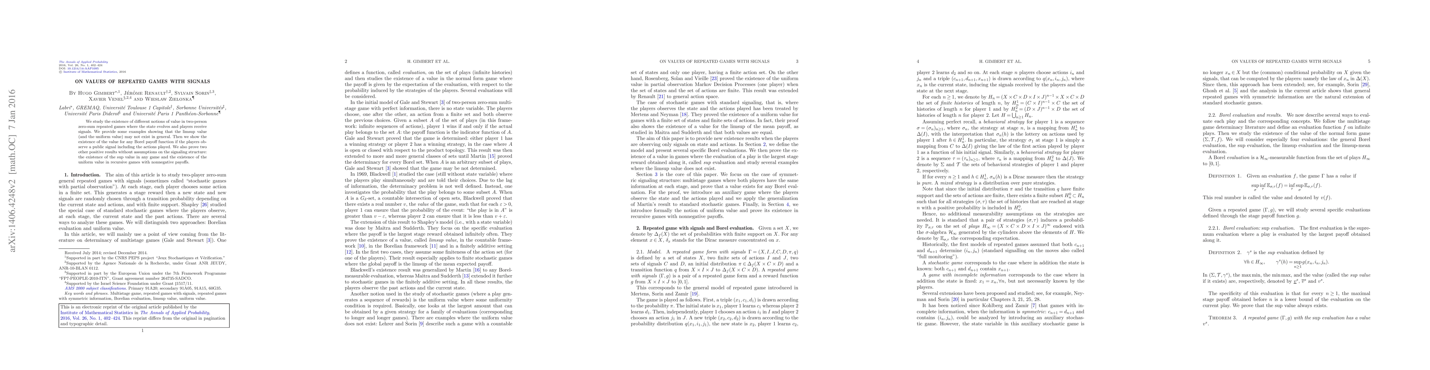 We study the existence of different notions of value in two-person zero-sum repeated games where the state evolves and players receive signals. We provide some examples showing that the limsup value (and the uniform value) may not exist in general. Then we show the existence of the value for any Borel payoff function if the players observe a public signal including the actions played. We also prove two other positive results without assumptions on the signaling structure: the existence of the $\sup$ value in any game and the existence of the uniform value in recursive games with nonnegative payoffs.