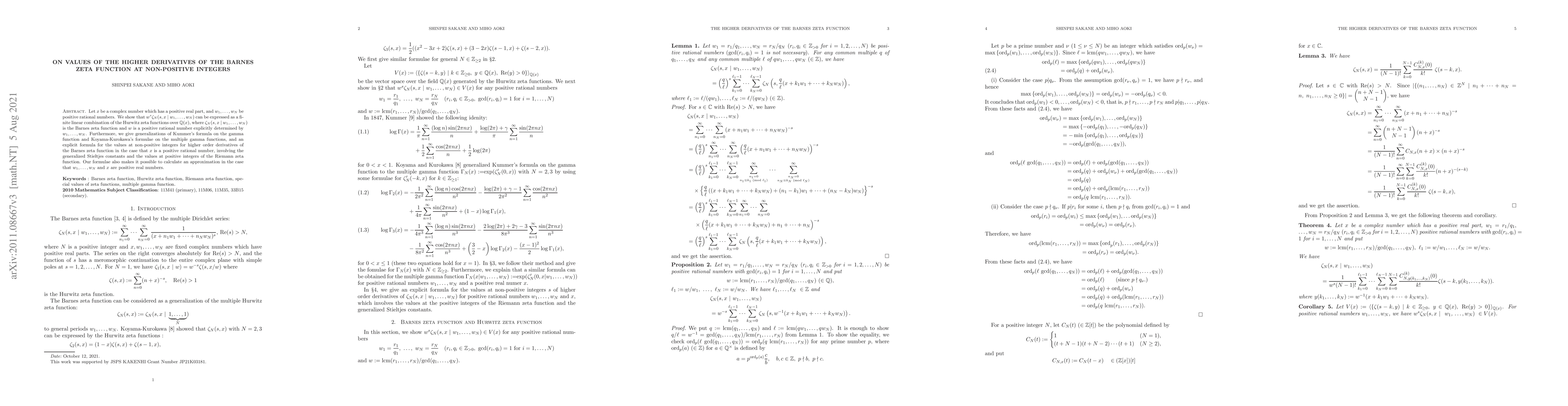 This paper explores the values of higher derivatives of the Barnes zeta function at non-positive integers, expressing them as linear combinations of Hurwitz zeta functions. It also generalizes Kummer's and Koyama-Kurokawa's formulas and provides explicit expressions involving generalized Stieltjes constants and Riemann zeta values.