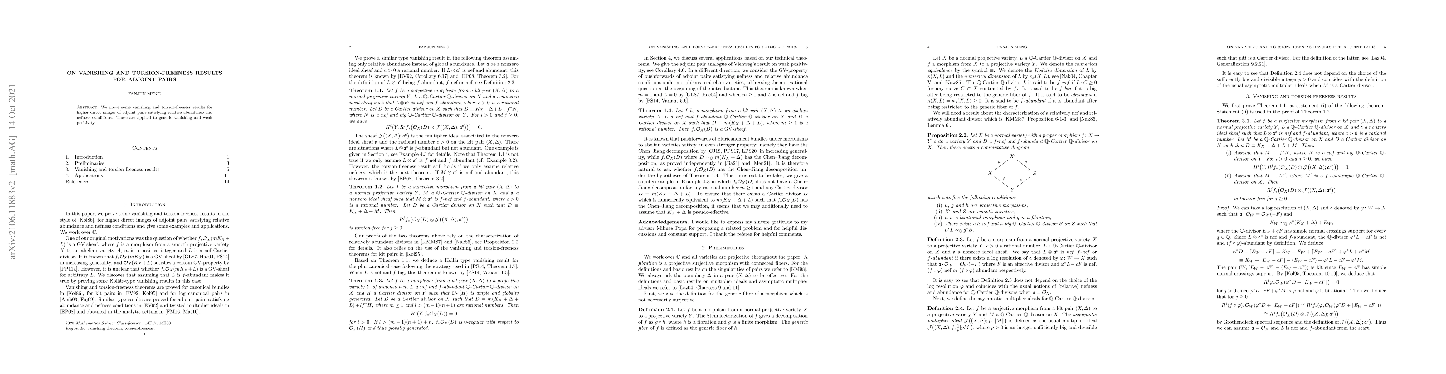 Summary: This paper establishes vanishing and torsion-freeness results for higher direct images of adjoint pairs under relative abundance and nefness conditions, and applies these results to demonstrate generic vanishing and weak positivity.