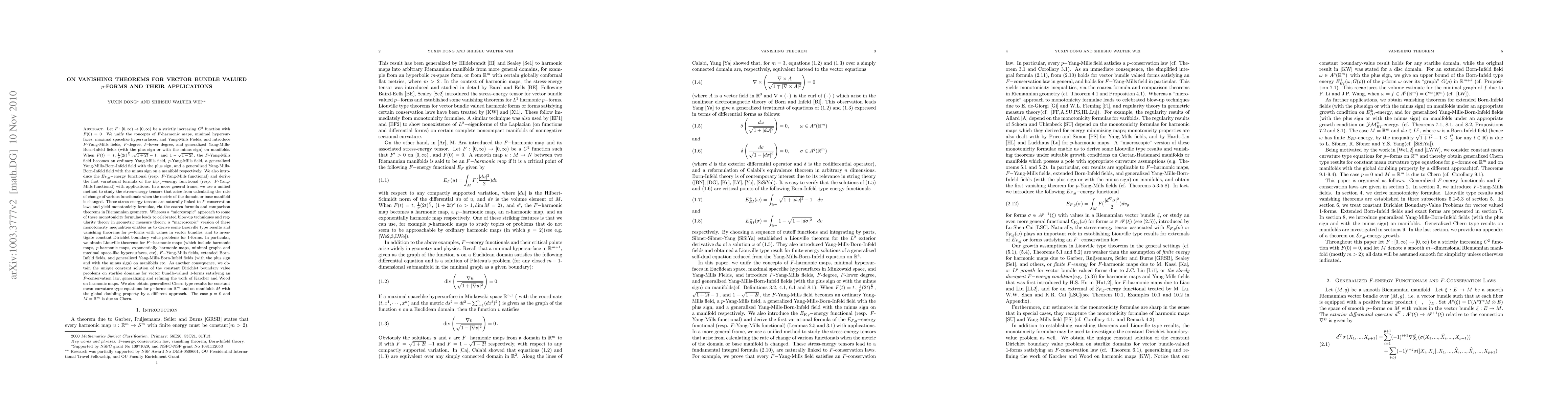 Let $F: [0, \infty) \to [0, \infty)$ be a strictly increasing $C^2$ function with $F(0)=0$. We unify the concepts of $F$-harmonic maps, minimal hypersurfaces, maximal spacelike hypersurfaces, and Yang-Mills Fields, and introduce $F$-Yang-Mills fields, $F$-degree, $F$-lower degree, and generalized Yang-Mills-Born-Infeld fields (with the plus sign or with the minus sign) on manifolds. When $F(t)=t, \frac 1p(2t)^{\frac p2}, \sqrt{1+2t} -1,$ and $1-\sqrt{1-2t},$ the $F$-Yang-Mills field becomes an ordinary Yang-Mills field, $p$-Yang-Mills field, a generalized Yang-Mills-Born-Infeld field with the plus sign, and a generalized Yang-Mills-Born-Infeld field with the minus sign on a manifold respectively. We also introduce the $E_{F,g}-$energy functional (resp. $F$-Yang-Mills functional) and derive the first variational formula of the $E_{F,g}-$energy functional (resp. $F$-Yang-Mills functional) with applications. In a more general frame, we use a unified method to study the stress-energy tensors that arise from calculating the rate of change of various functionals when the metric of the domain or base manifold is changed. These stress-energy tensors, linked to $F$-conservation laws yield monotonicity formulae. A "macroscopic" version of these monotonicity inequalities enables us to derive some Liouville type results and vanishing theorems for $p-$forms with values in vector bundles, and to investigate constant Dirichlet boundary value problems for 1-forms. In particular, we obtain Liouville theorems for $F-$harmonic maps (e.g. $p$-harmonic maps), and $F-$Yang-Mills fields (e.g. generalized Yang-Mills-Born-Infeld fields on manifolds). We also obtain generalized Chern type results for constant mean curvature type equations for $p-$forms on $\Bbb{R}^m$ and on manifolds $M$ with the global doubling property by a different approach. The case $p=0$ and $M=\mathbb{R}^m$ is due to Chern.