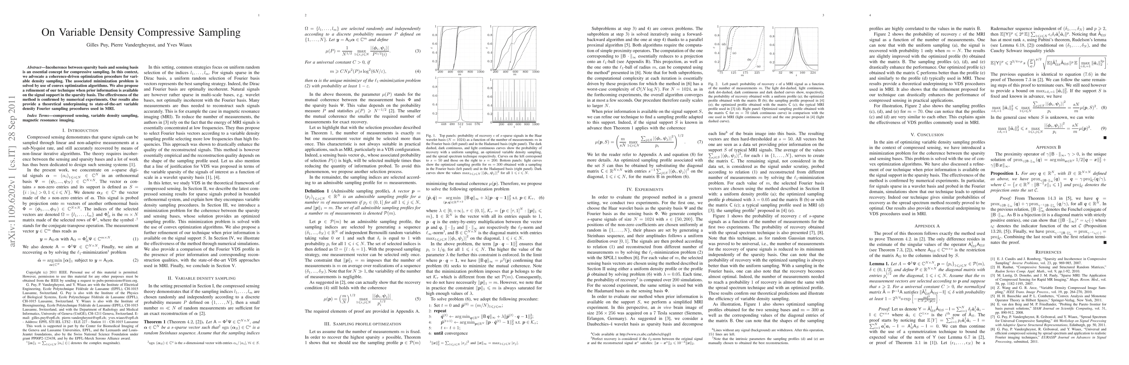The paper proposes an optimization method for variable density sampling in compressed sensing, minimizing coherence between sparsity and sensing bases. It also refines the technique with prior signal support information and validates the approach through experiments, providing theoretical backing for variable density Fourier sampling in MRI.