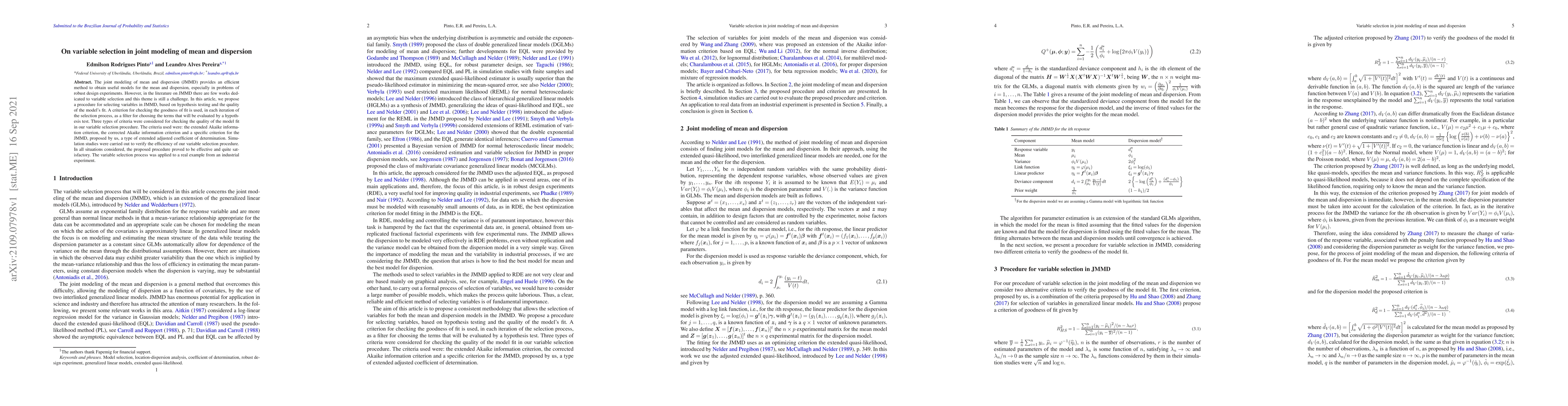 A new variable selection procedure for joint modeling of mean and dispersion (JMMD) is proposed, using hypothesis testing and model fit criteria, with promising results in simulation studies.