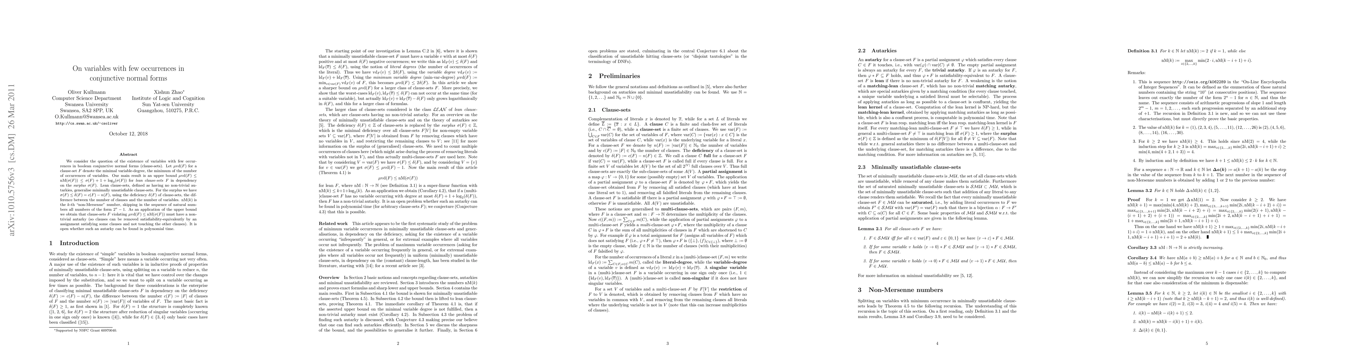 We consider the question of the existence of variables with few occurrences in boolean conjunctive normal forms (clause-sets). Let mvd(F) for a clause-set F denote the minimal variable-degree, the minimum of the number of occurrences of variables. Our main result is an upper bound mvd(F) <= nM(surp(F)) <= surp(F) + 1 + log_2(surp(F)) for lean clause-sets F in dependency on the surplus surp(F). - Lean clause-sets, defined as having no non-trivial autarkies, generalise minimally unsatisfiable clause-sets. - For the surplus we have surp(F) <= delta(F) = c(F) - n(F), using the deficiency delta(F) of clause-sets, the difference between the number of clauses and the number of variables. - nM(k) is the k-th "non-Mersenne" number, skipping in the sequence of natural numbers all numbers of the form 2^n - 1. We conjecture that this bound is nearly precise for minimally unsatisfiable clause-sets. As an application of the upper bound we obtain that (arbitrary!) clause-sets F with mvd(F) > nM(surp(F)) must have a non-trivial autarky (so clauses can be removed satisfiability-equivalently by an assignment satisfying some clauses and not touching the other clauses). It is open whether such an autarky can be found in polynomial time. As a future application we discuss the classification of minimally unsatisfiable clause-sets depending on the deficiency.