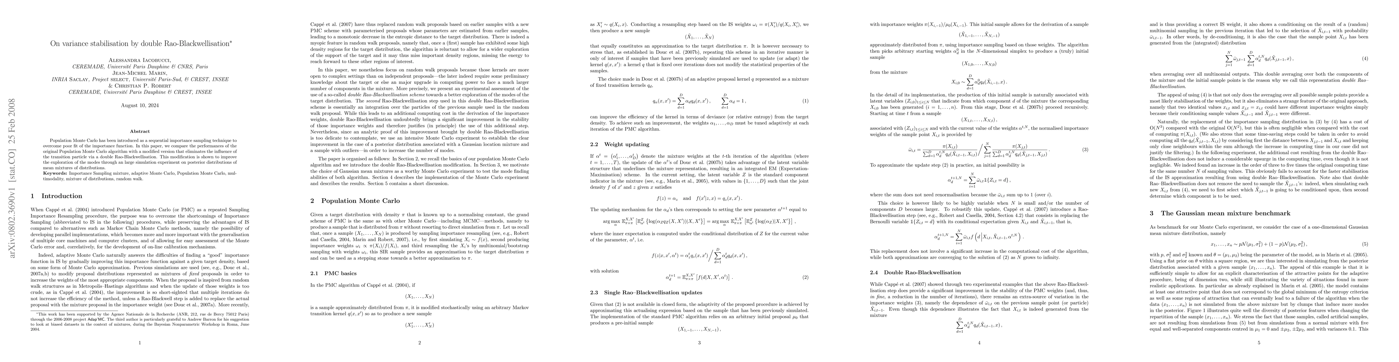 This paper compares the performance of the original Population Monte Carlo algorithm with a modified version that uses double Rao-Blackwellisation to eliminate the influence of the transition particle, demonstrating improved exploration of modes through simulations on posterior distributions of mean mixtures of distributions.