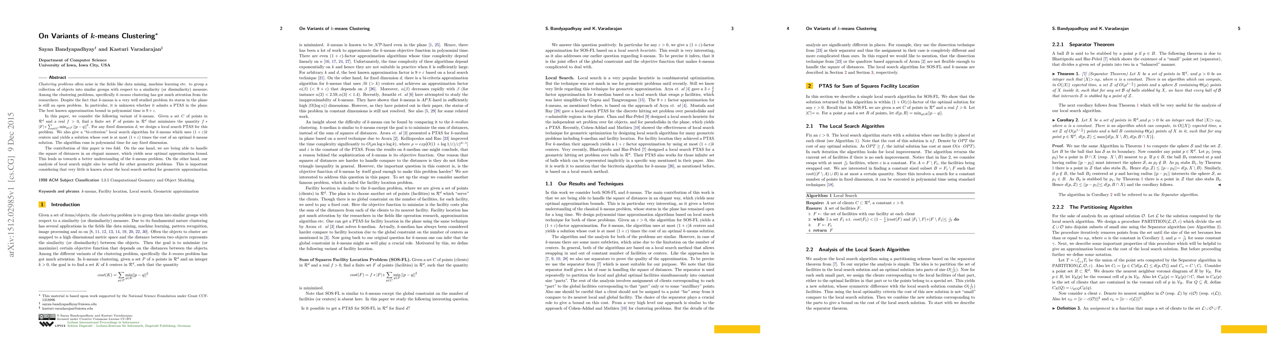 This paper explores variants of $k$-means clustering, proposing a local search PTAS for minimizing a specific objective function involving point sets in $\mathcal{R}^d$. It also introduces a bi-criterion local search algorithm for $k$-means, achieving a near-optimal approximation bound and demonstrating potential applications beyond $k$-means.