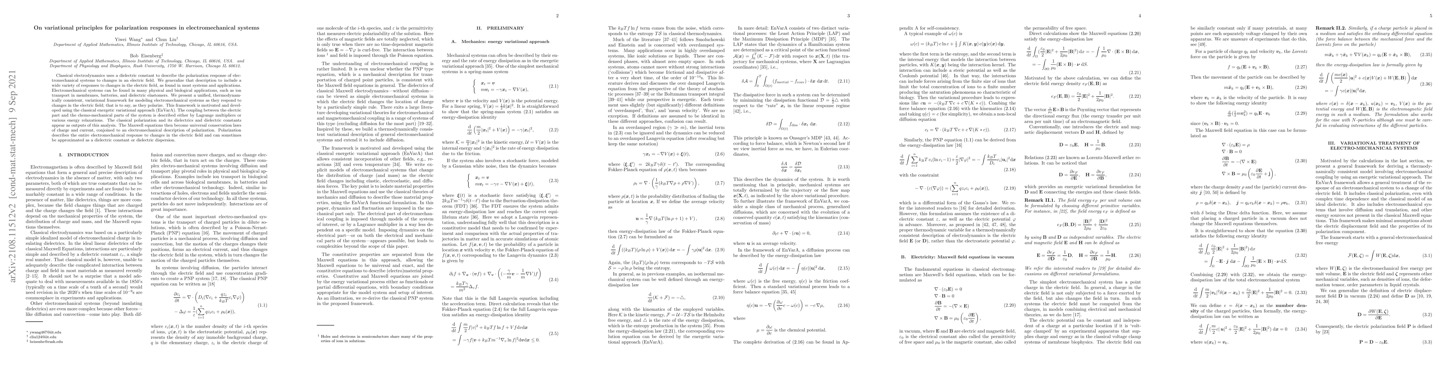 Classical electrodynamics uses a dielectric constant to describe the polarization response of electromechanical systems to changes in an electric field. We generalize that description to include a wide variety of responses to changes in the electric field, as found in most systems and applications. Electromechanical systems can be found in many physical and biological applications, such as ion transport in membranes, batteries, and dielectric elastomers. We present a unified, thermodynamically consistent, variational framework for modeling electromechanical systems as they respond to changes in the electric field; that is to say, as they polarize. This framework is motivated and developed using the classical energetic variational approach (EnVarA). The coupling between the electric part and the chemo-mechanical parts of the system is described either by Lagrange multipliers or various energy relaxations. The classical polarization and its dielectrics and dielectric constants appear as outputs of this analysis. The Maxwell equations then become universal conservation laws of charge and current, conjoined to an electromechanical description of polarization. Polarization describes the entire electromechanical response to changes in the electric field and can sometimes be approximated as a dielectric constant or dielectric dispersion.