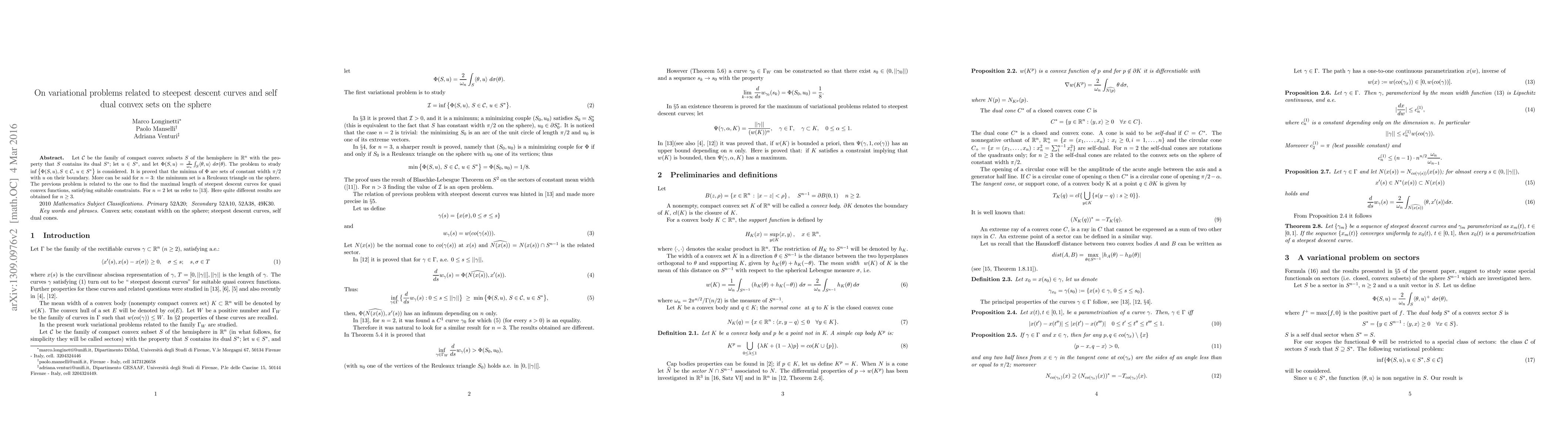 This paper investigates variational problems related to steepest descent curves and self-dual convex sets on the sphere, proving that the minimum of a specific functional $\Phi$ is achieved by sets of constant width $\pi/2$ with $u$ on their boundary. For $n=3$, the minimum set is identified as a Reuleaux triangle on the sphere.