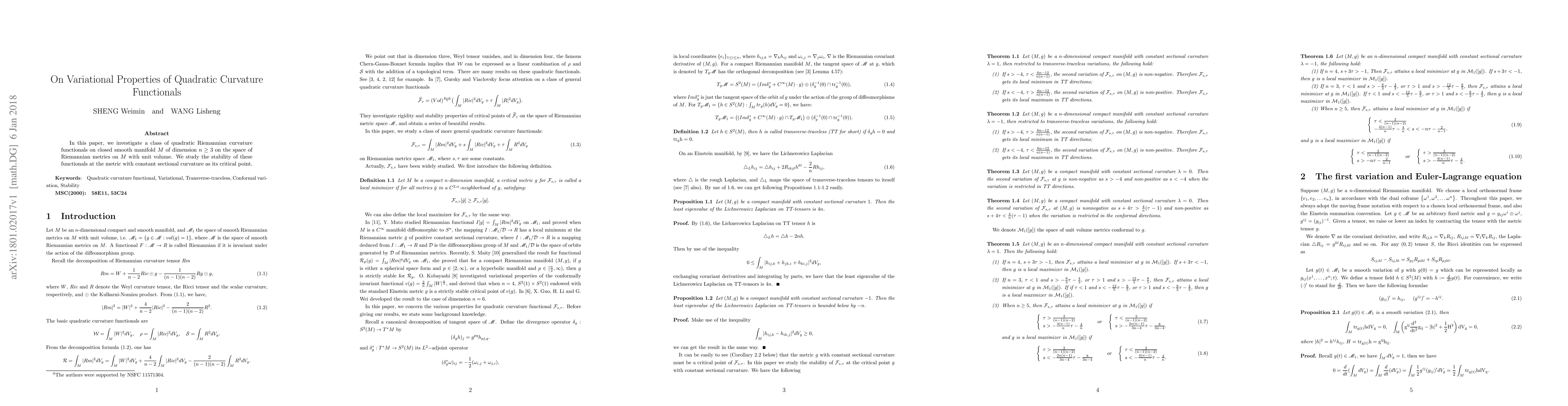 In this paper, we investigate a class of quadratic Riemannian curvature functionals on closed smooth manifold $M$ of dimension $n\ge 3$ on the space of Riemannian metrics on $M$ with unit volume. We study the stability of these functionals at the metric with constant sectional curvature as its critical point.