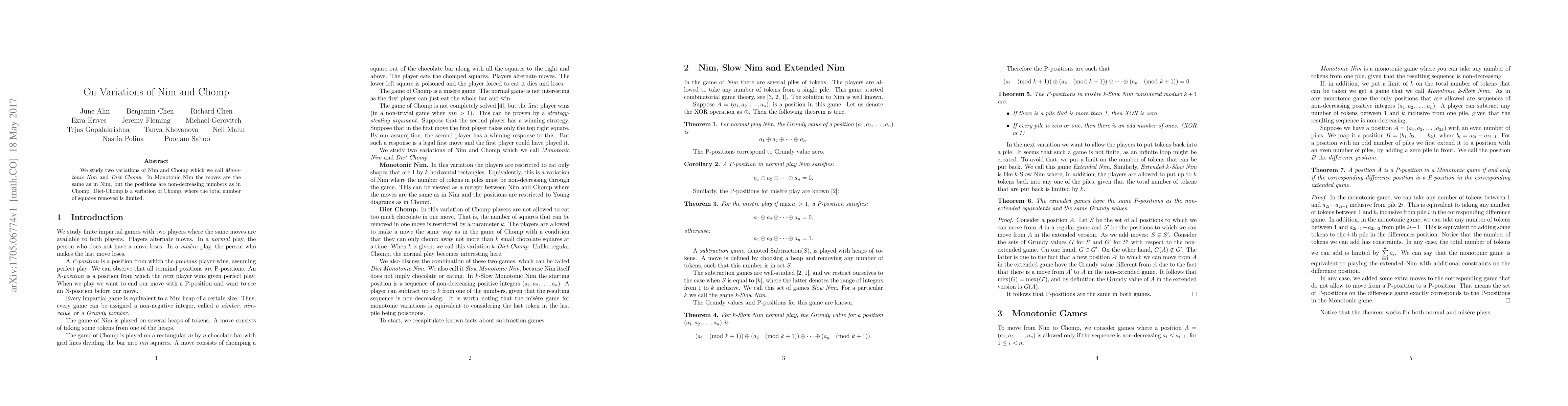 This paper explores two variations of the games Nim and Chomp: Monotonic Nim, where positions are non-decreasing like in Chomp, and Diet Chomp, a limited version of Chomp where the total number of squares removed is restricted. The study focuses on the strategic elements and game outcomes of these variations.