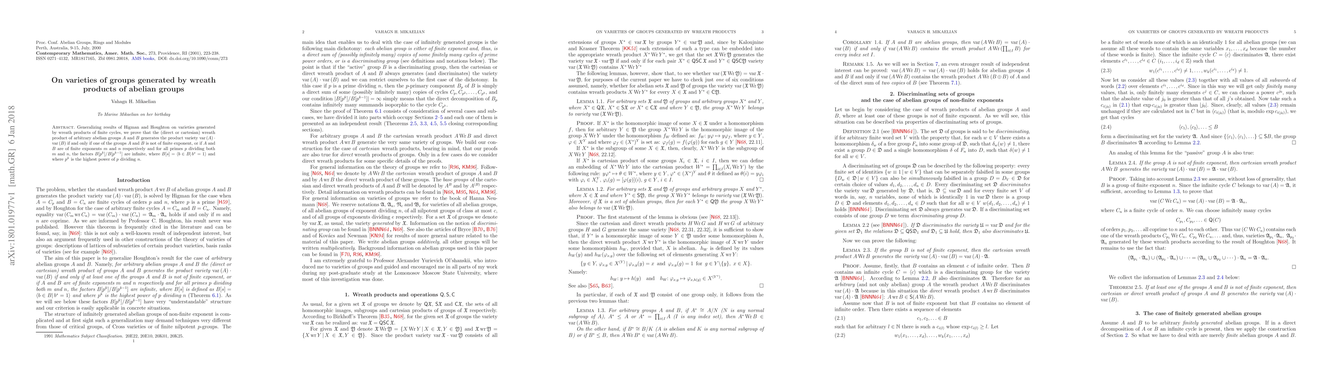 Research proves that wreath products of abelian groups generate a variety if one group is not finite exponent or the factors within the second group are infinite for certain prime powers.