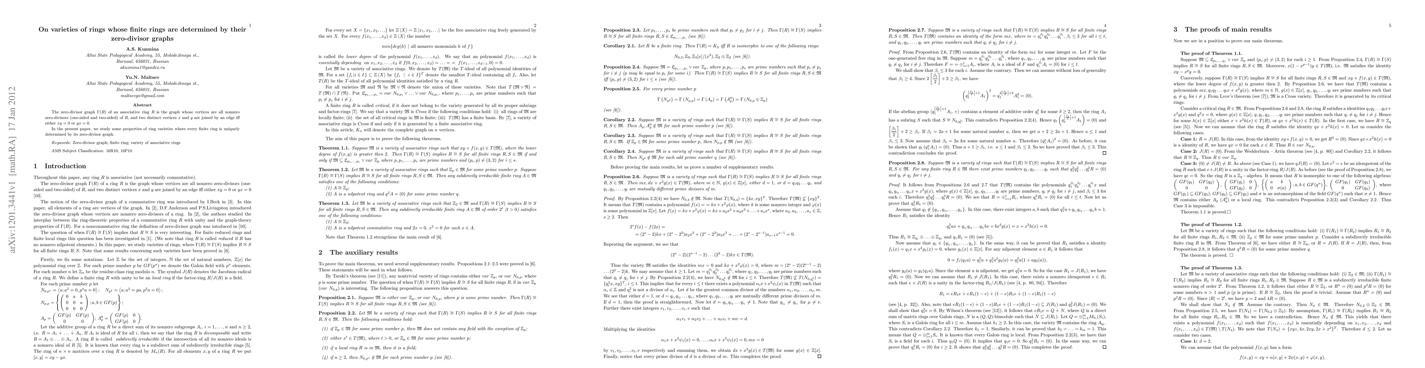 The zero-divisor graph $\Gamma(R)$ of an associative ring $R$ is the graph whose vertices are all nonzero zero-divisors (one-sided and two-sided) of $R$, and two distinct vertices $x$ and $y$ are joined by an edge iff either $xy=0$ or $yx=0$. In the present paper, we study some properties of ring varieties where every finite ring is uniquely determined by its zero-divisor graph.