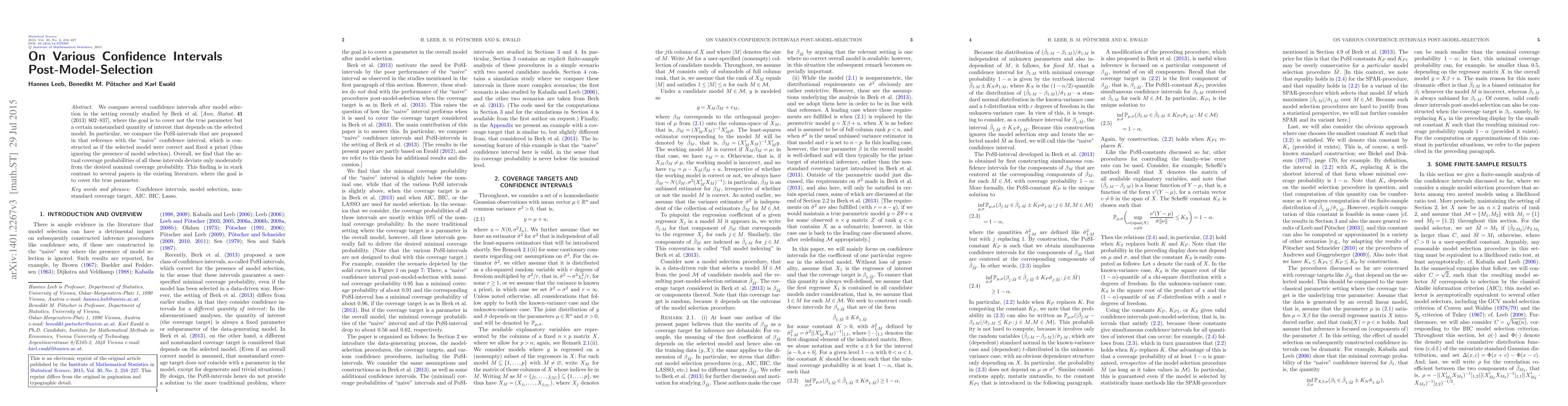 This paper compares various confidence intervals post-model selection, focusing on nonstandard quantities of interest rather than the true parameter. It finds that the actual coverage probabilities of these intervals, including PoSI-intervals and the "naive" approach, only moderately deviate from the desired nominal coverage, contrasting with literature that covers the true parameter.