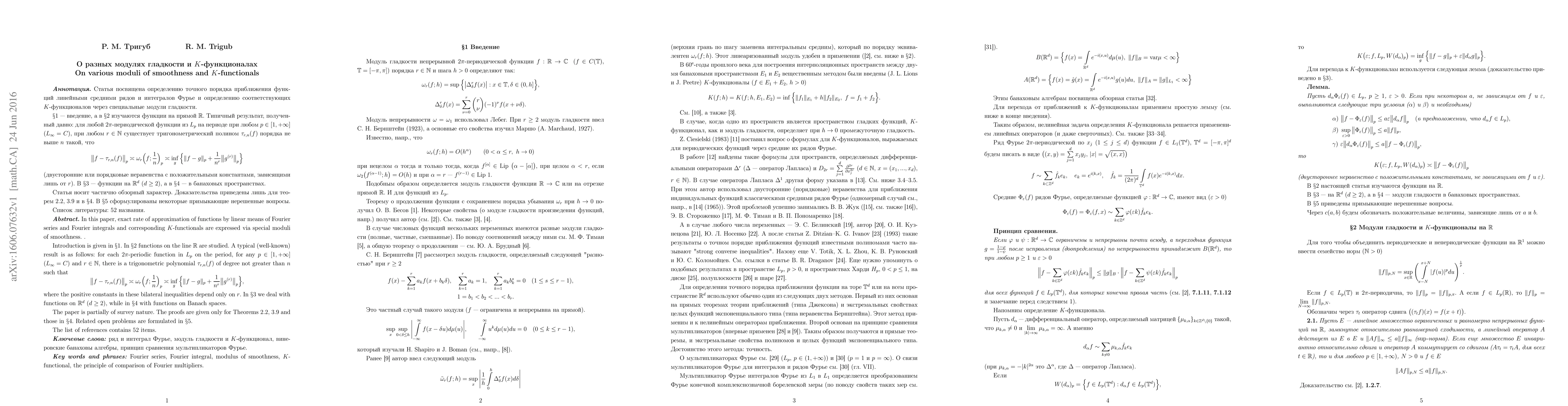 In this paper, exact rate of approximation of functions by linear means of Fourier series and Fourier integrals and corresponding $K$-functionals are expressed via special moduli of smoothness. . Introduction is given in $\S 1$. In $\S2$ functions on the line $\mathbb{R}$ are studied. A typical (well-known) result is as follows: for each $2\pi$-periodic function in $L_p$ on the period, for any $p\in[1,+\infty]$ ($L_\infty=C$) and $r\in\mathbb{N}$, there is a trigonometric polynomial $\tau_{r,n}(f)$ of degree not greater than $n$ such that \big\|f-\tau_{r,n}(f)\big\|_p\asymp\omega_r\Big(f;\frac{1}{n}\Big)_p\asymp \inf\limits_{g}\Big\{\|f-g\|_p+\frac{1}{n^r}\big\|g^{(r)}\big\|_p\Big\}, where the positive constants in these bilateral inequalities depend only on $r$. In $\S 3$ we deal with functions on $\mathbb{R}^d$ ($d\geq2$), while in $\S 4$ with functions on Banach spaces. The paper is partially of survey nature. The proofs are given only for Theorems 2.2, 3.9 and those in $\S 4$. Related open problems are formulated in $\S 5$. The list of references contains 52 items.
