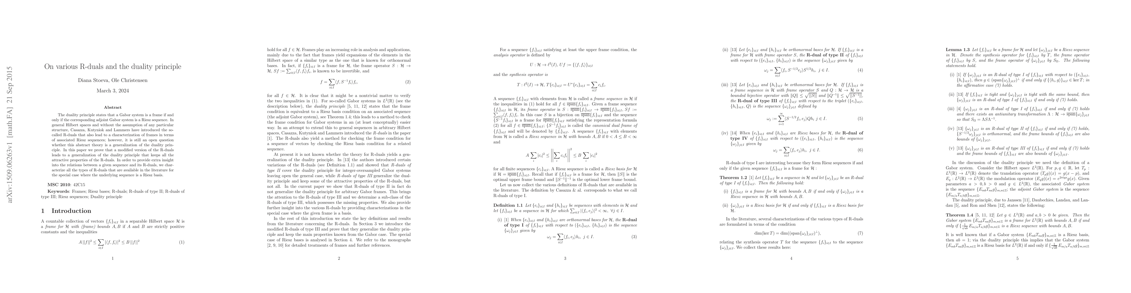 The duality principle states that a Gabor system is a frame if and only if the corresponding adjoint Gabor system is a Riesz sequence. In general Hilbert spaces and without the assumption of any particular structure, Casazza, Kutyniok and Lammers have introduced the so-called R-duals that also lead to a characterization of frames in terms of associated Riesz sequences; however, it is still an open question whether this abstract theory is a generalization of the duality principle. In this paper we prove that a modified version of the R-duals leads to a generalization of the duality principle that keeps all the attractive properties of the R-duals. In order to provide extra insight into the relations between a given sequence and its R-duals, we characterize all the types of R-duals that are available in the literature for the special case where the underlying sequence is a Riesz basis.