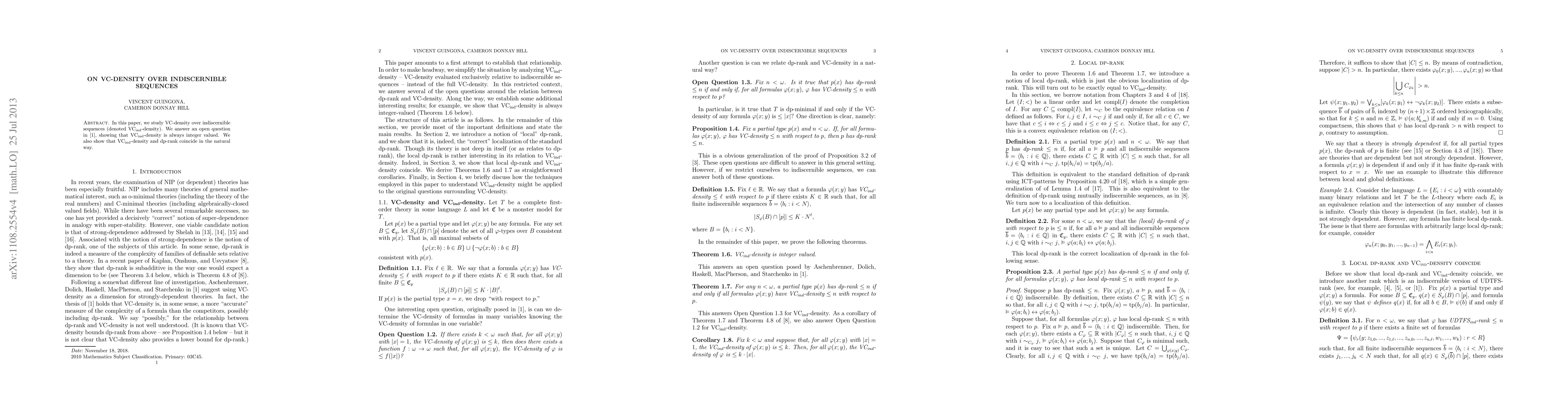 This paper investigates VC-density over indiscernible sequences (VC_ind-density), proving it is always integer-valued and demonstrating its equivalence with dp-rank. This resolves an open question and establishes a significant relationship in model theory.