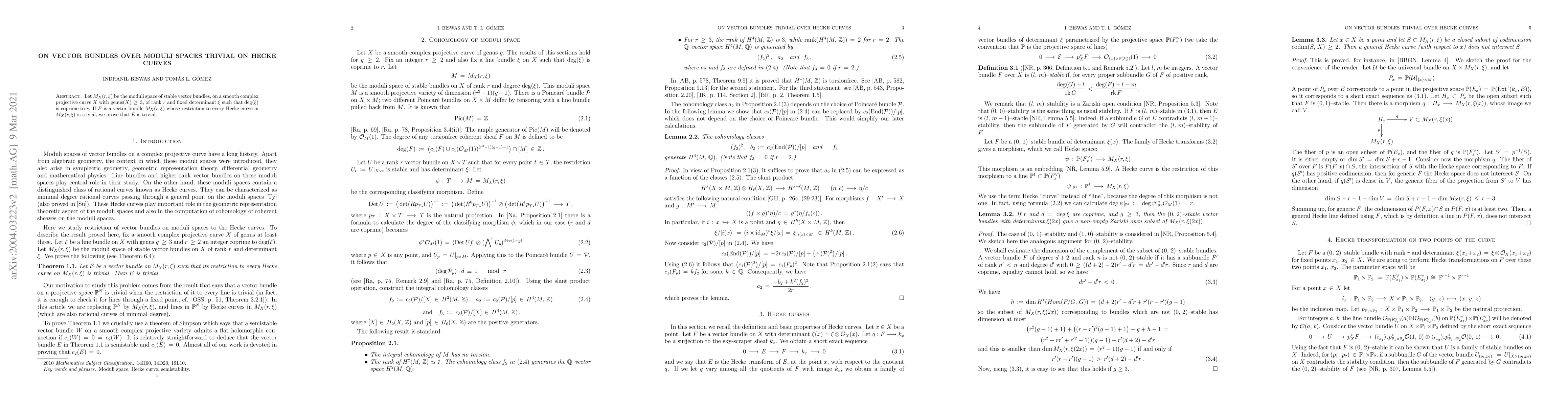 Researchers prove that if a vector bundle on a moduli space of stable bundles is trivial over every Hecke curve in the space, then it is trivial everywhere, providing insight into vector bundle properties on complex projective curves.