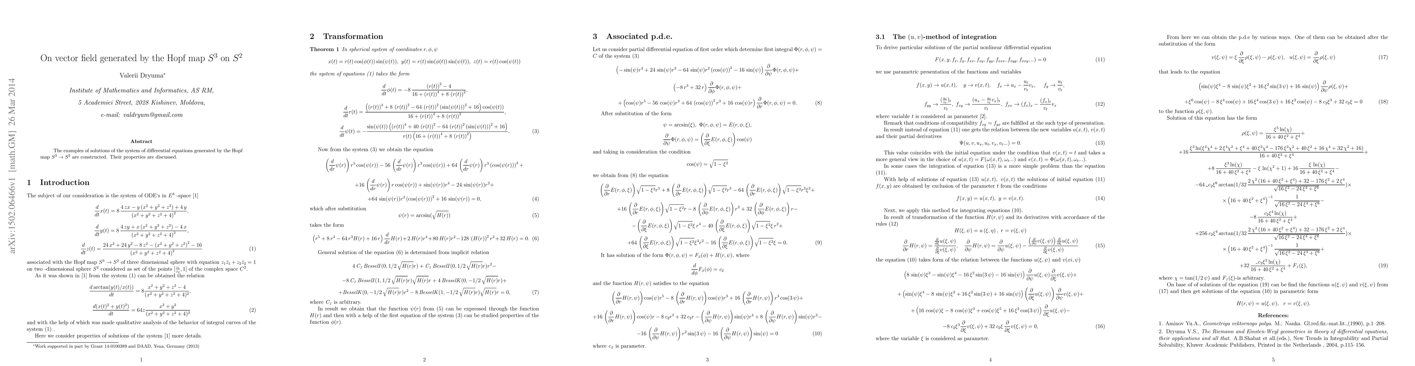 The paper derives a first-order partial differential equation associated with the system and solves it using the (u, v)-method of integration, providing explicit solutions for the vector field generated by the Hopf map.