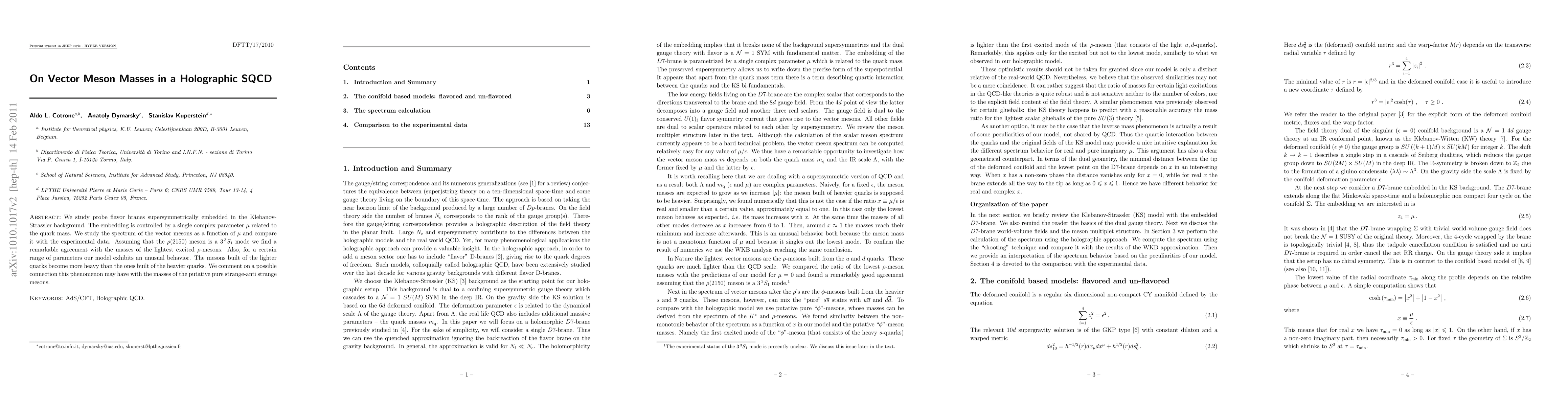 We study probe flavor branes supersymmetrically embedded in the Klebanov-Strassler background. The embedding is controlled by a single complex parameter mu related to the quark mass. We study the spectrum of the vector mesons as a function of mu and compare it with the experimental data. Assuming that the rho(2150) meson is a 3S mode we find a remarkable agreement with the masses of the lightest excited rho-mesons. Also, for a certain range of parameters our model exhibits an unusual behavior. The mesons built of the lighter quarks become more heavy than the ones built of the heavier quarks. We comment on a possible connection this phenomenon may have with the masses of the putative pure strange-anti strange mesons.