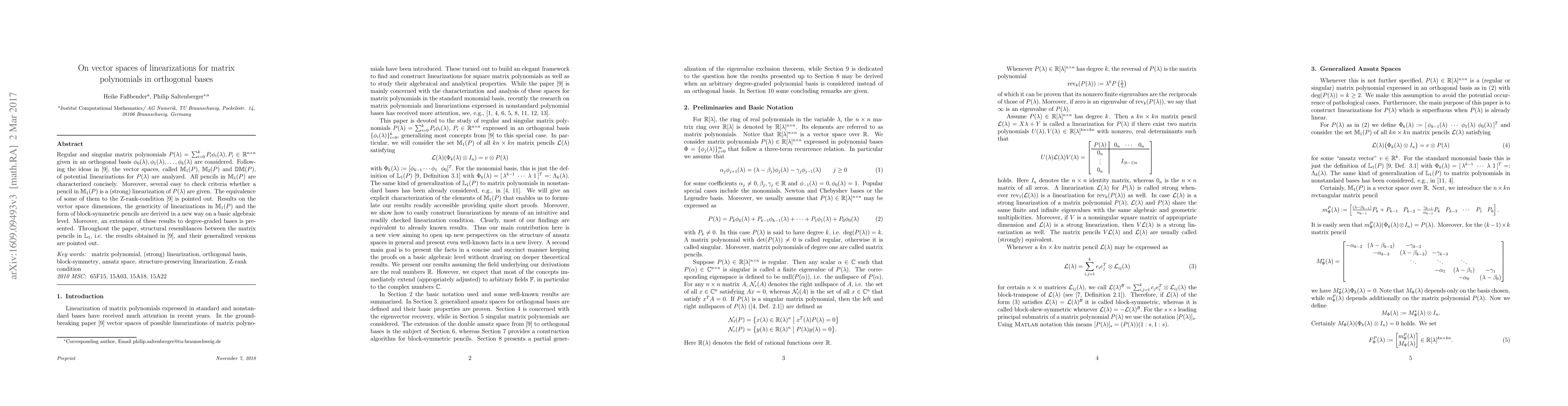 This paper analyzes matrix polynomials expressed in orthogonal bases, focusing on the vector spaces M1(P), M2(P), and DM(P) of potential linearizations. It characterizes all pencils in M1(P) and provides criteria for determining if a pencil is a (strong) linearization of P, highlighting their equivalence to the Z-rank-condition.