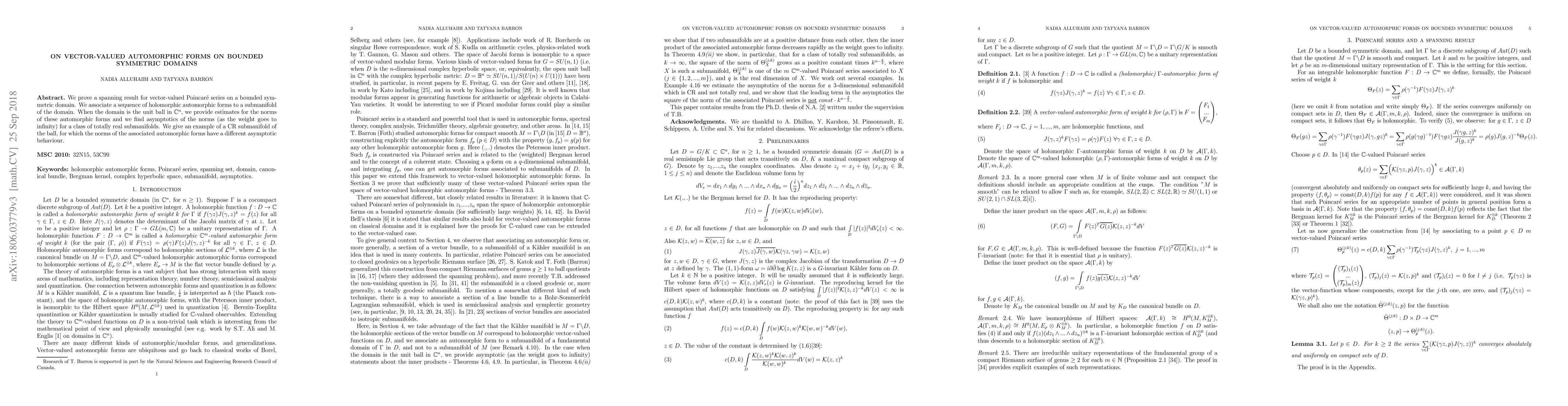 This paper proves a spanning result for vector-valued Poincaré series on bounded symmetric domains and associates holomorphic automorphic forms to submanifolds. For the unit ball in ${\Bbb{C}}^n$, it provides norm estimates and asymptotic behavior for these forms, with a notable example of a CR submanifold showing different asymptotic behavior.