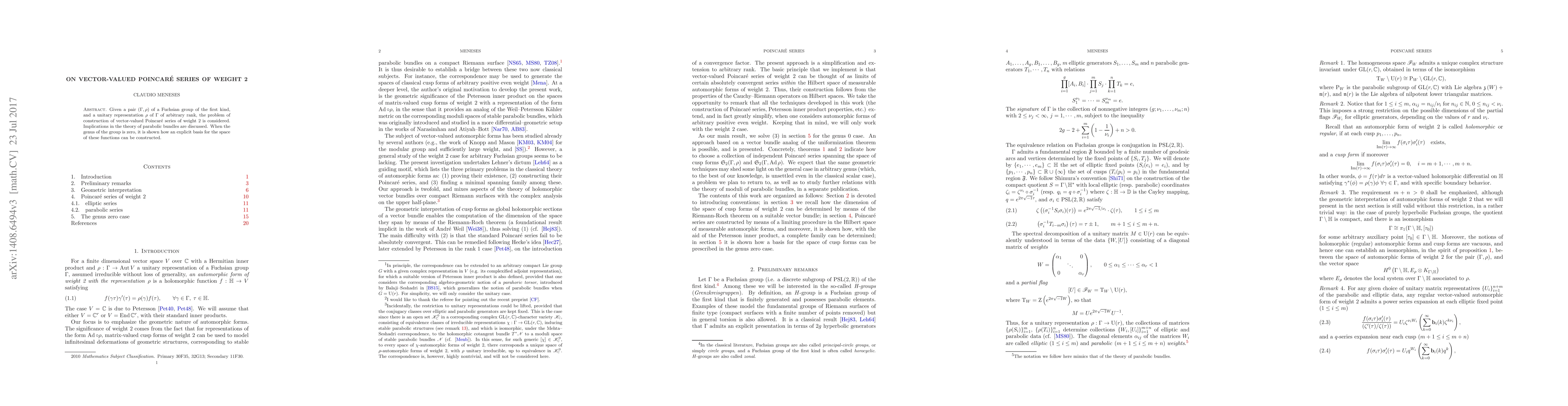 Given a pair $(\Gamma,\rho)$ of a Fuchsian group of the first kind, and a unitary representation $\rho$ of $\Gamma$ of arbitrary rank, the problem of construction of vector-valued Poincar\'e series of weight 2 is considered. Implications in the theory of parabolic bundles are discussed. When the genus of the group is zero, it is shown how an explicit basis for the space of these functions can be constructed.