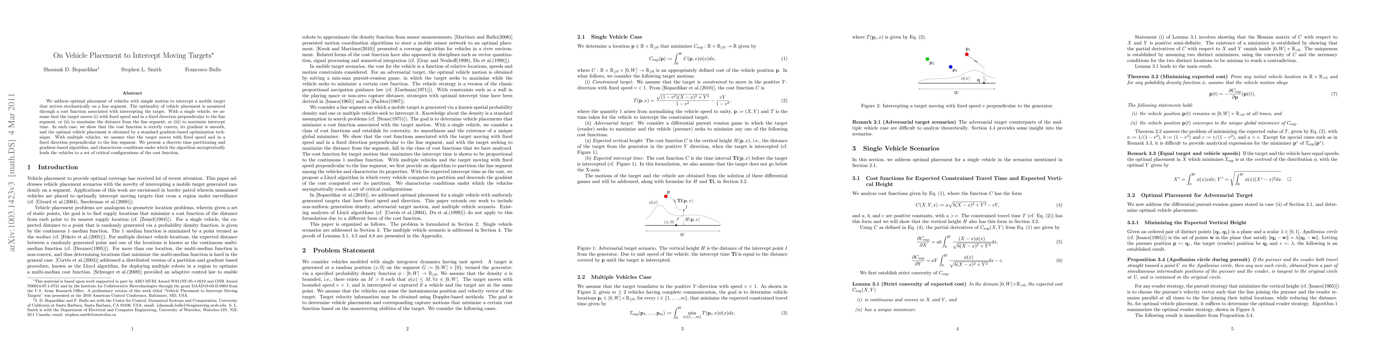 We address optimal placement of vehicles with simple motion to intercept a mobile target that arrives stochastically on a line segment. The optimality of vehicle placement is measured through a cost function associated with intercepting the target. With a single vehicle, we assume that the target moves (i) with fixed speed and in a fixed direction perpendicular to the line segment, or (ii) to maximize the distance from the line segment, or (iii) to maximize intercept time. In each case, we show that the cost function is strictly convex, its gradient is smooth, and the optimal vehicle placement is obtained by a standard gradient-based optimization technique. With multiple vehicles, we assume that the target moves with fixed speed and in a fixed direction perpendicular to the line segment. We present a discrete time partitioning and gradient-based algorithm, and characterize conditions under which the algorithm asymptotically leads the vehicles to a set of critical configurations of the cost function.