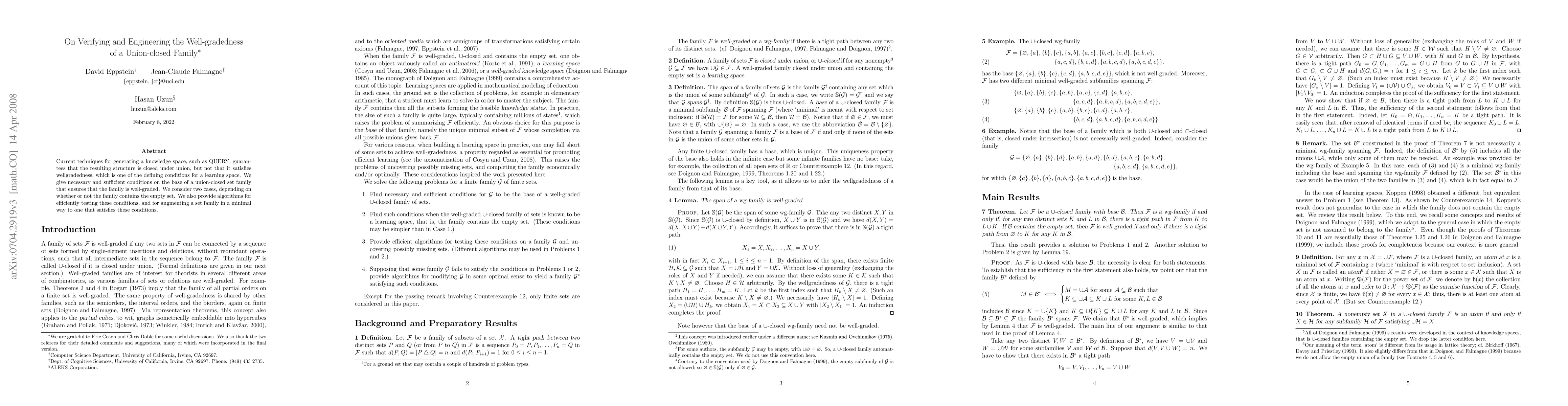 Current techniques for generating a knowledge space, such as QUERY, guarantees that the resulting structure is closed under union, but not that it satisfies wellgradedness, which is one of the defining conditions for a learning space. We give necessary and sufficient conditions on the base of a union-closed set family that ensures that the family is well-graded. We consider two cases, depending on whether or not the family contains the empty set. We also provide algorithms for efficiently testing these conditions, and for augmenting a set family in a minimal way to one that satisfies these conditions.