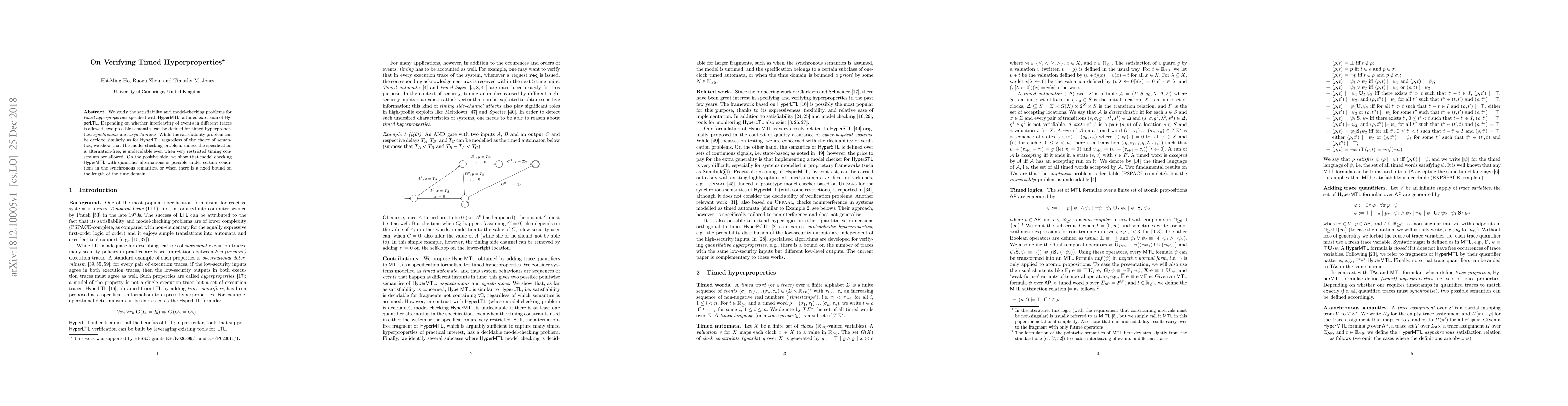 We study the satisfiability and model-checking problems for timed hyperproperties specified with HyperMTL, a timed extension of HyperLTL. Depending on whether interleaving of events in different traces is allowed, two possible semantics can be defined for timed hyperproperties: asynchronous and synchronous. While the satisfiability problem can be decided similarly to HyperLTL regardless of the choice of semantics, we show that the model-checking problem, unless the specification is alternation-free, is undecidable even when very restricted timing constraints are allowed. On the positive side, we show that model checking HyperMTL with quantifier alternations is possible under certain conditions in the synchronous semantics, or when there is a fixed bound on the length of the time domain.