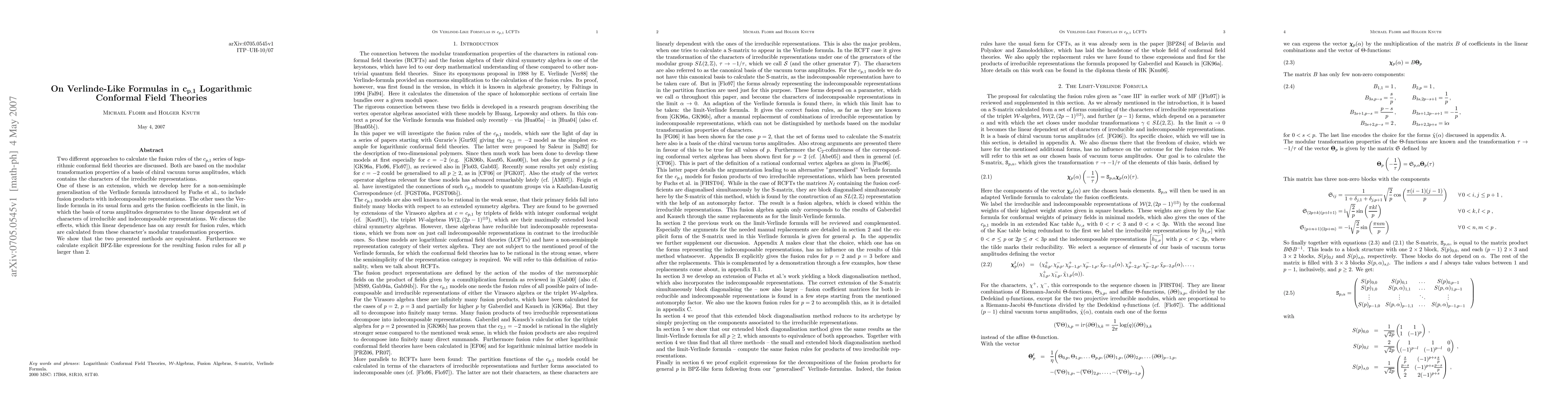 This paper discusses two methods for calculating fusion rules in c_{p,1} logarithmic conformal field theories, based on modular transformation properties of chiral vacuum torus amplitudes. It extends the Verlinde formula to include indecomposable representations and shows equivalence with a method that uses the Verlinde formula under certain limits, providing explicit BPZ-like expressions for fusion rules for p > 2.