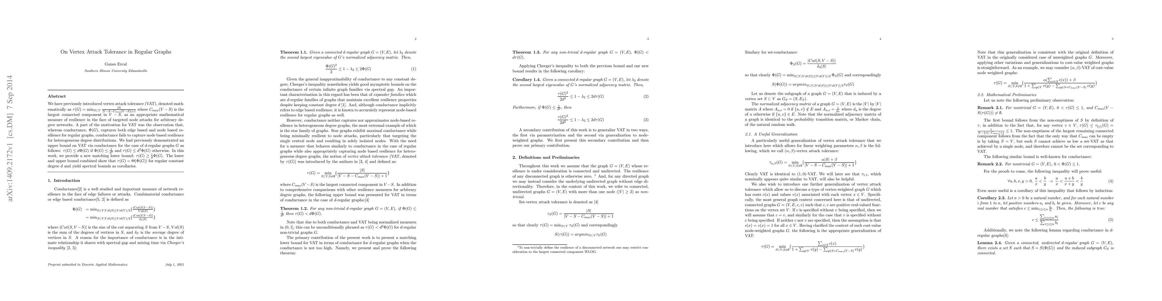 We have previously introduced vertex attack tolerance (VAT), denoted mathematically as $\tau(G) = \min_{S \subset V} \frac{|S|}{|V-S-C_{max}(V-S)|+1}$ where $C_{max}(V-S)$ is the largest connected component in $V-S$, as an appropriate mathematical measure of resilience in the face of targeted node attacks for arbitrary degree networks. A part of the motivation for VAT was the observation that, whereas conductance, $\Phi(G)$, captures both edge based and node based resilience for regular graphs, conductance fails to capture node based resilience for heterogeneous degree distributions. We had previously demonstrated an upper bound on VAT via conductance for the case of $d$-regular graphs $G$ as follows: $\tau(G) \le d\Phi(G)$ if $\Phi(G) \le \frac{1}{d^2}$ and $\tau(G) \le d^2\Phi(G)$ otherwise. In this work, we provide a new matching lower bound: $\tau(G) \ge \frac{1}{d}\Phi(G)$. The lower and upper bound combined show that $\tau(G) = \Theta(\Phi(G))$ for regular constant degree $d$ and yield spectral bounds as corollaries.