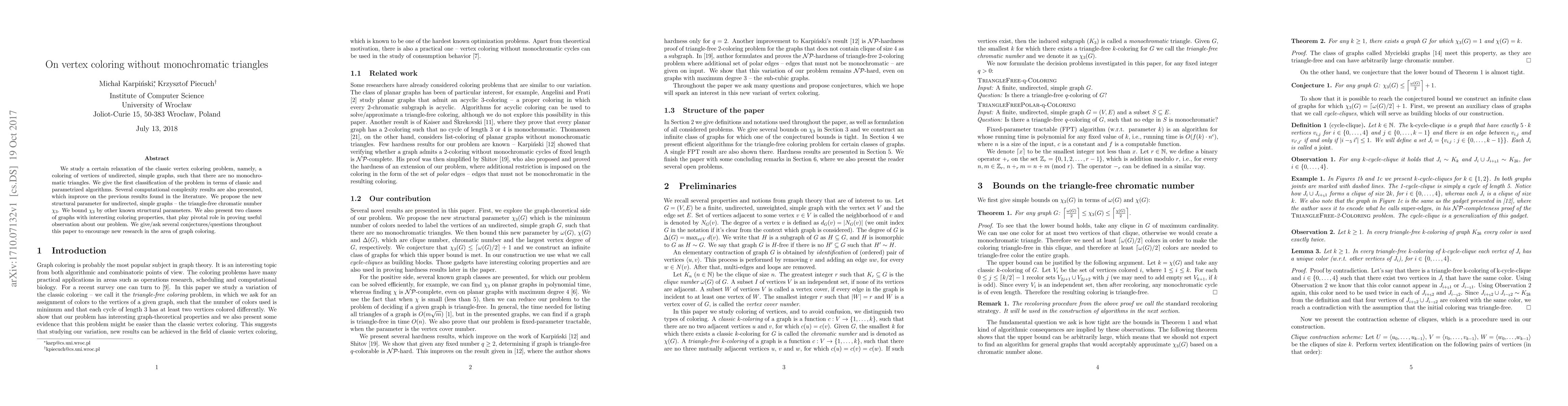 We study a certain relaxation of the classic vertex coloring problem, namely, a coloring of vertices of undirected, simple graphs, such that there are no monochromatic triangles. We give the first classification of the problem in terms of classic and parametrized algorithms. Several computational complexity results are also presented, which improve on the previous results found in the literature. We propose the new structural parameter for undirected, simple graphs -- the triangle-free chromatic number $\chi_3$. We bound $\chi_3$ by other known structural parameters. We also present two classes of graphs with interesting coloring properties, that play pivotal role in proving useful observation about our problem. We give/ask several conjectures/questions throughout this paper to encourage new research in the area of graph coloring.