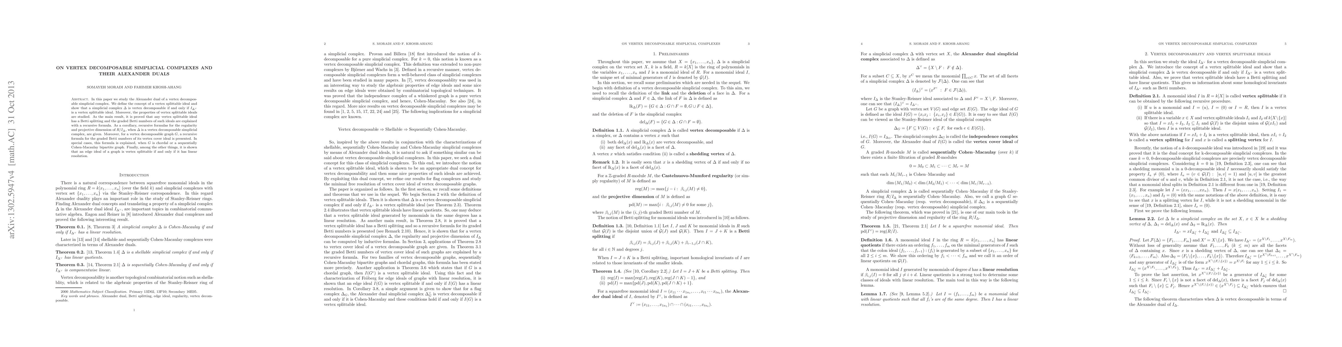 This paper explores the Alexander dual of vertex decomposable simplicial complexes, introducing vertex splittable ideals. It proves that a complex is vertex decomposable if its dual ideal is vertex splittable, and provides recursive formulas for Betti numbers, regularity, and projective dimension of such ideals.