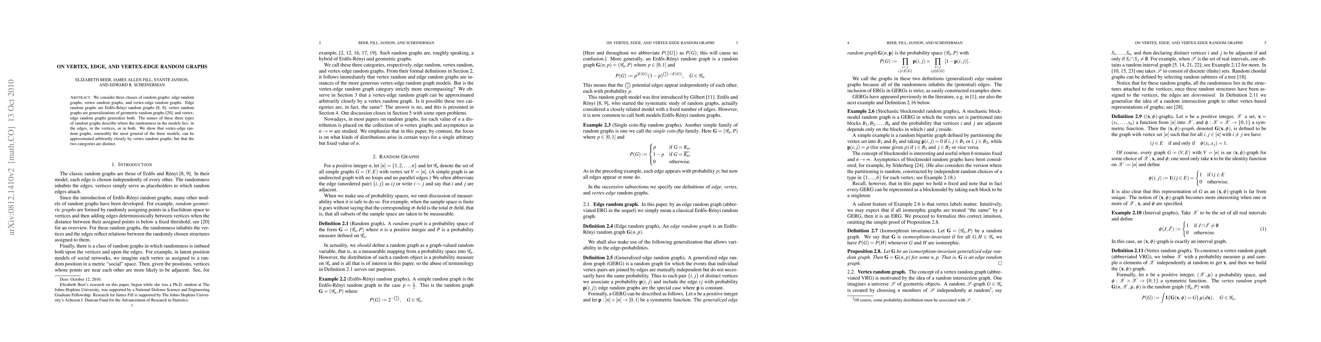 Summary: This paper explores three classes of random graphs: edge random, vertex random, and vertex-edge random graphs. It demonstrates that vertex-edge random graphs can be closely approximated by vertex random graphs, though they remain distinct categories.