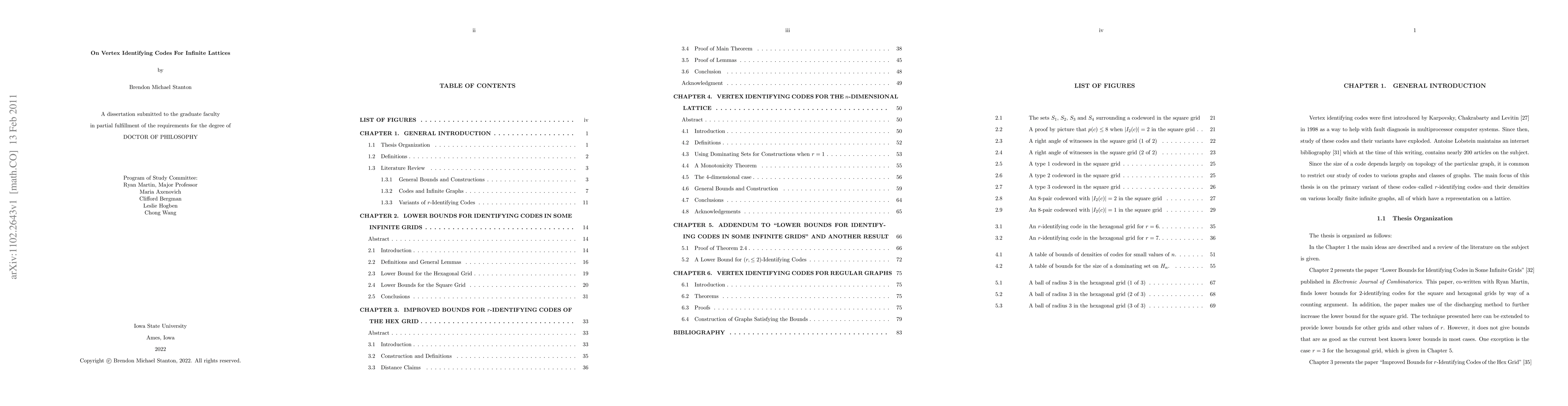 Summary: This thesis compiles research on vertex identifying codes for infinite lattices, presenting lower bounds for identifying codes in infinite grids, improved bounds for r-identifying codes in the hex grid, and results for n-dimensional lattices, contributing to the understanding of these codes in infinite structures.