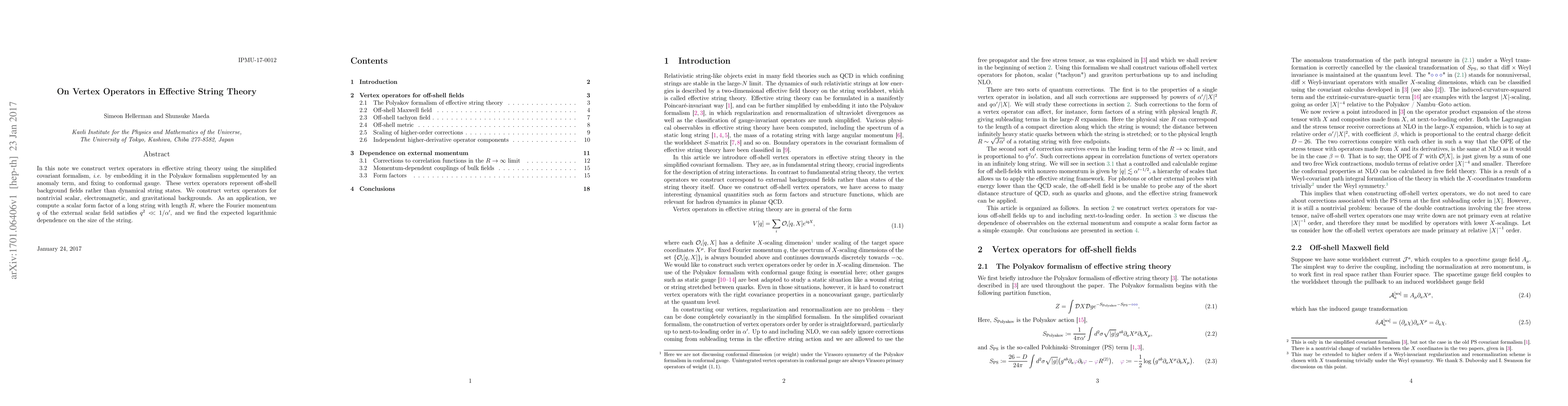This paper constructs vertex operators in effective string theory using a simplified covariant formalism embedded in the Polyakov framework, focusing on off-shell background fields. It computes a scalar form factor for long strings, revealing a logarithmic dependence on the string's size for low external field momenta.
