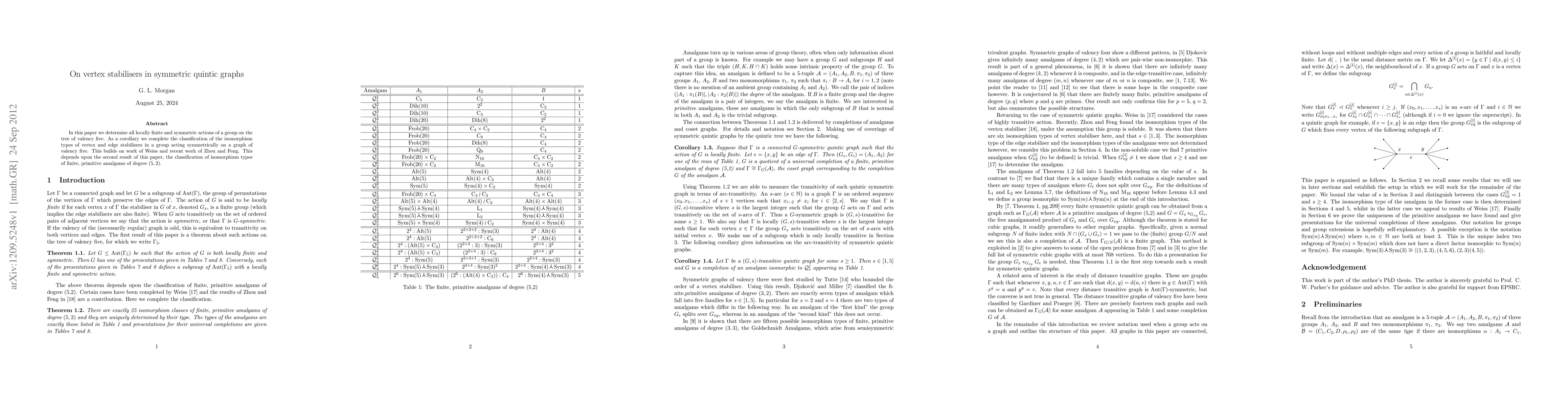 In this paper we determine all locally finite and symmetric actions of a group on the tree of valency five. As a corollary we complete the classification of the isomorphism types of vertex and edge stabilisers in a group acting symmetrically on a graph of valency five. This builds on work of Weiss and recent work of Zhou and Feng. This depends upon the second result of this paper, the classification of isomorphism types of finite, primitive amalgams of degree (5, 2).