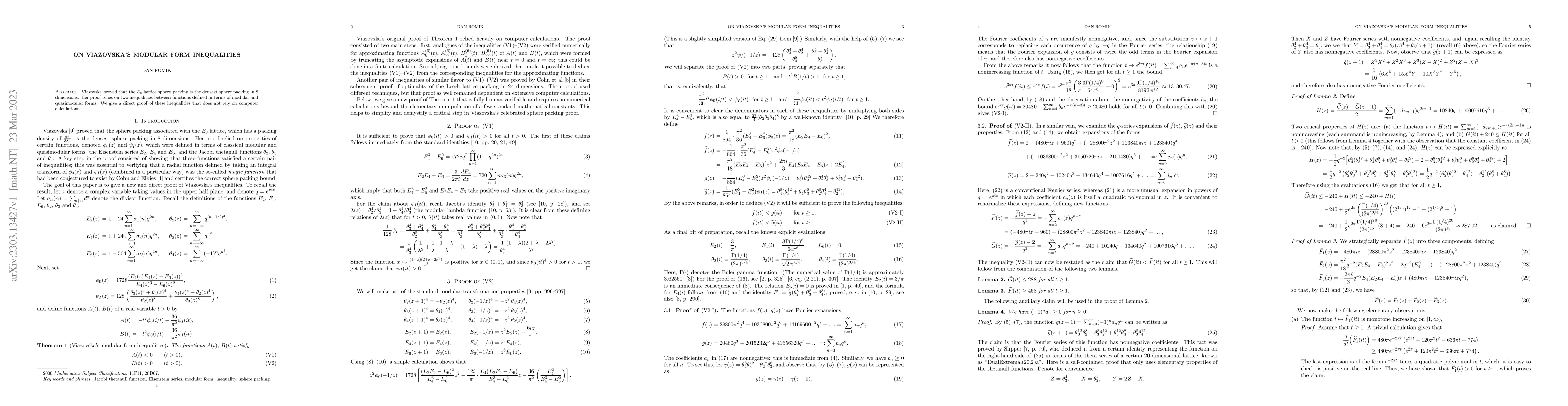 Viazovska proved that the $E_8$ lattice sphere packing is the densest sphere packing in 8 dimensions. Her proof relies on two inequalities between functions defined in terms of modular and quasimodular forms. We give a direct proof of these inequalities that does not rely on computer calculations.