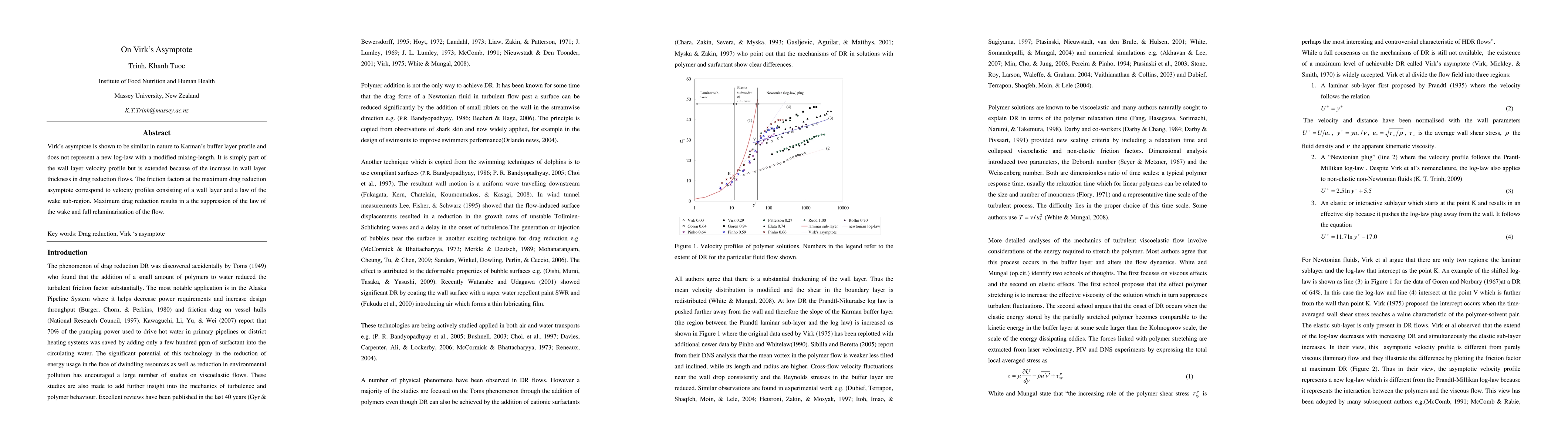 The Virk asymptote is shown to be similar in nature to the Karman buffer layer profile and does not represent a new log-law with a modified mixing-length. It is simply part of the wall layer velocity profile but is extended because of the increase in wall layer thickness in drag reduction flows. The friction factors at the maximum drag reduction asymptote correspond to velocity profiles consisting of a wall layer and a law of the wake sub-region. Maximum drag reduction results in the suppression of the law of the wake and full relaminarisation of the flow.