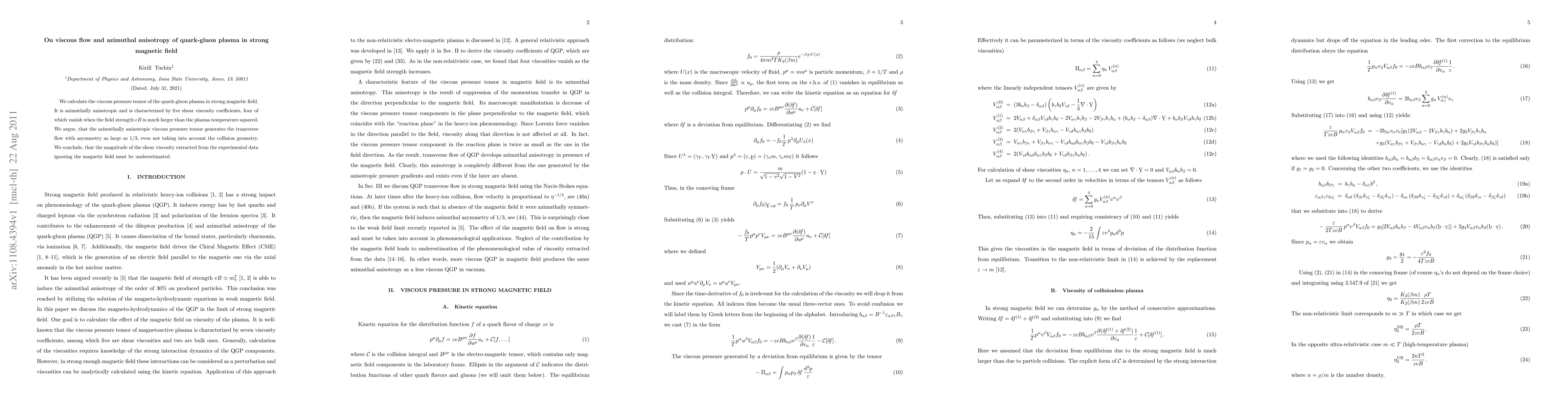 We calculate the viscous pressure tensor of the quark-gluon plasma in strong magnetic field. It is azimuthally anisotropic and is characterized by five shear viscosity coefficients, four of which vanish when the field strength eB is much larger than the plasma temperature squared. We argue, that the azimuthally anisotropic viscous pressure tensor generates the transverse flow with asymmetry as large as 1/3, even not taking into account the collision geometry. We conclude, that the magnitude of the shear viscosity extracted from the experimental data ignoring the magnetic field must be underestimated.