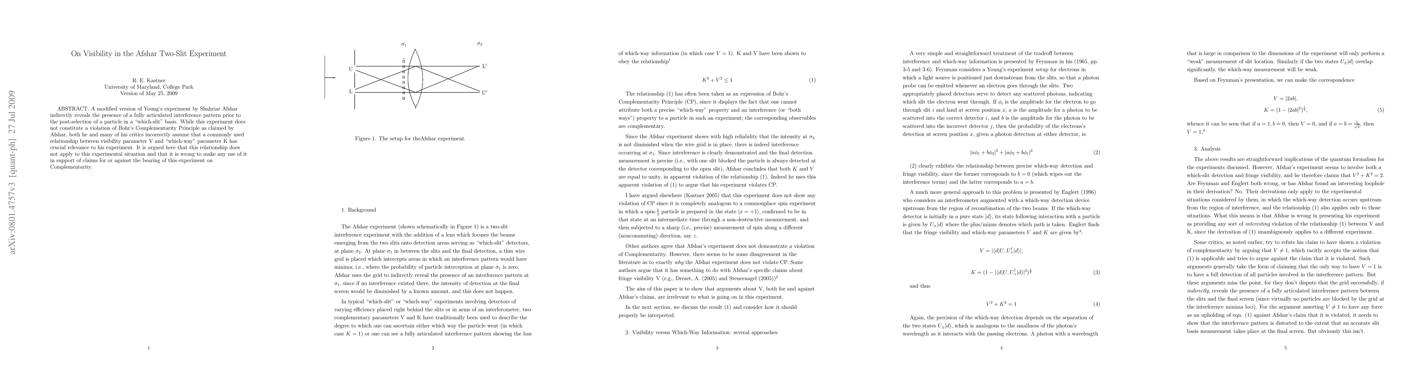 A modified version of Young's experiment by Shahriar Afshar indirectly reveals the presence of a fully articulated interference pattern prior to the post-selection of a particle in a "which-slit" basis. While this experiment does not constitute a violation of Bohr's Complementarity Principle as claimed by Afshar, both he and many of his critics incorrectly assume that a commonly used relationship between visibility parameter V and "which-way" parameter K has crucial relevance to his experiment. It is argued here that this relationship does not apply to this experimental situation and that it is wrong to make any use of it in support of claims for or against the bearing of this experiment on Complementarity.