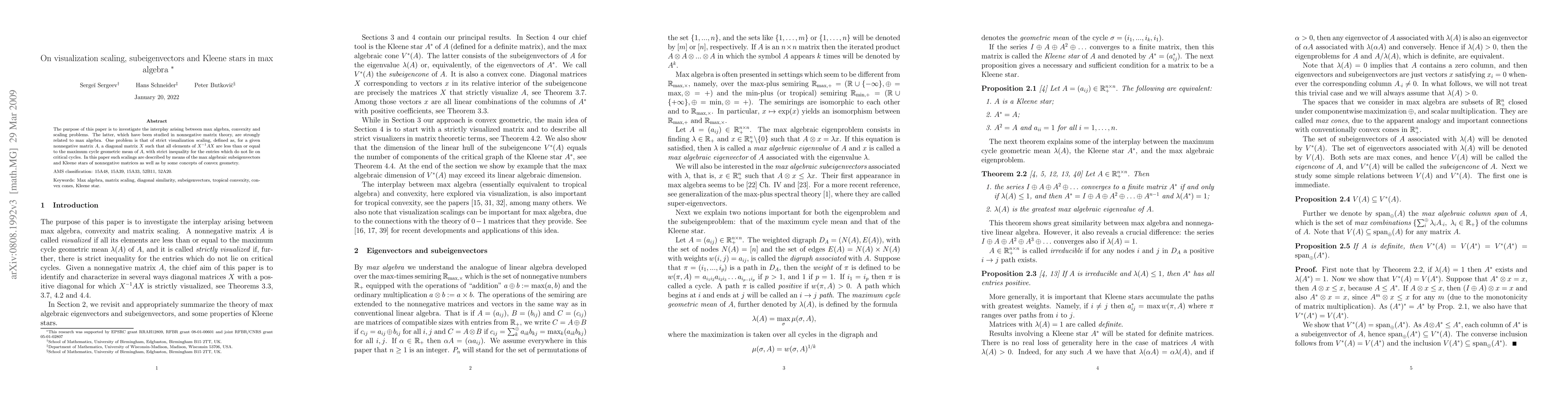 This paper explores the relationship between max algebra, convexity, and scaling problems, focusing on strict visualisation scaling of nonnegative matrices. It utilizes max-algebraic subeigenvectors and Kleene stars to describe these scalings, linking them to concepts from convex geometry.