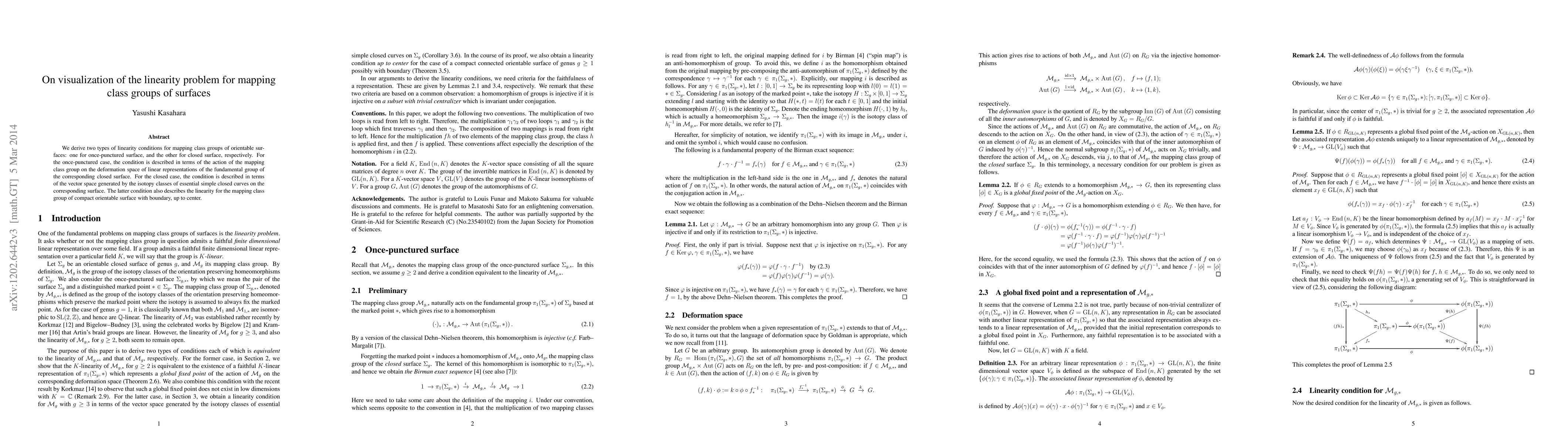 This paper establishes two linearity conditions for mapping class groups of orientable surfaces: one for once-punctured surfaces involving the action on linear representations, and another for closed surfaces based on essential simple closed curves, extending to surfaces with boundary minus their centers.