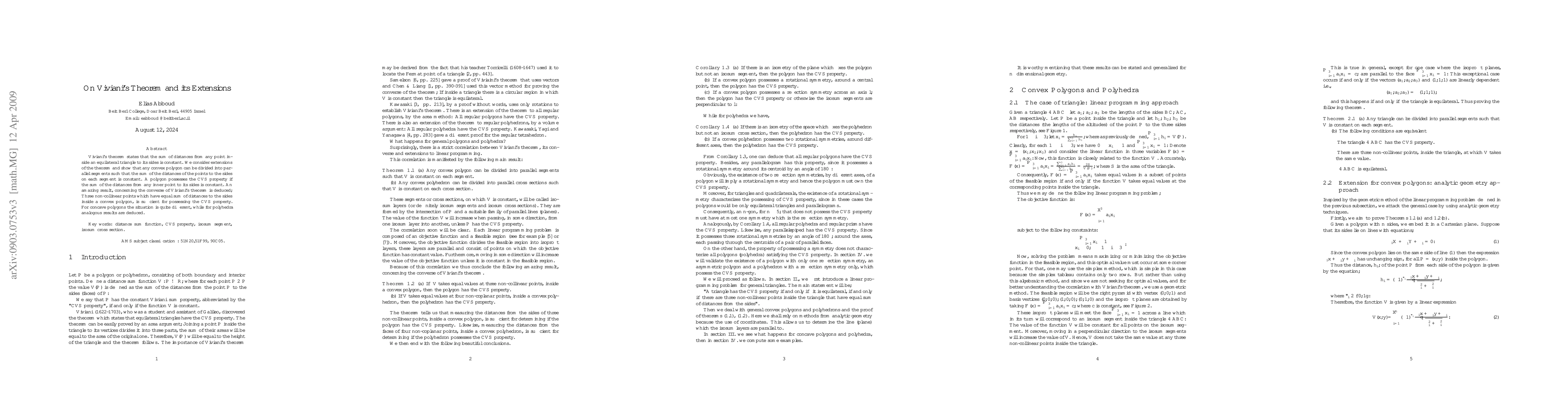 Viviani's theorem is extended to show that any convex polygon can be divided into segments where the sum of distances from points to the polygon's sides remains constant. The paper also proves that three non-collinear points with equal summed distances to the sides inside a convex polygon indicate the polygon's CVS property.