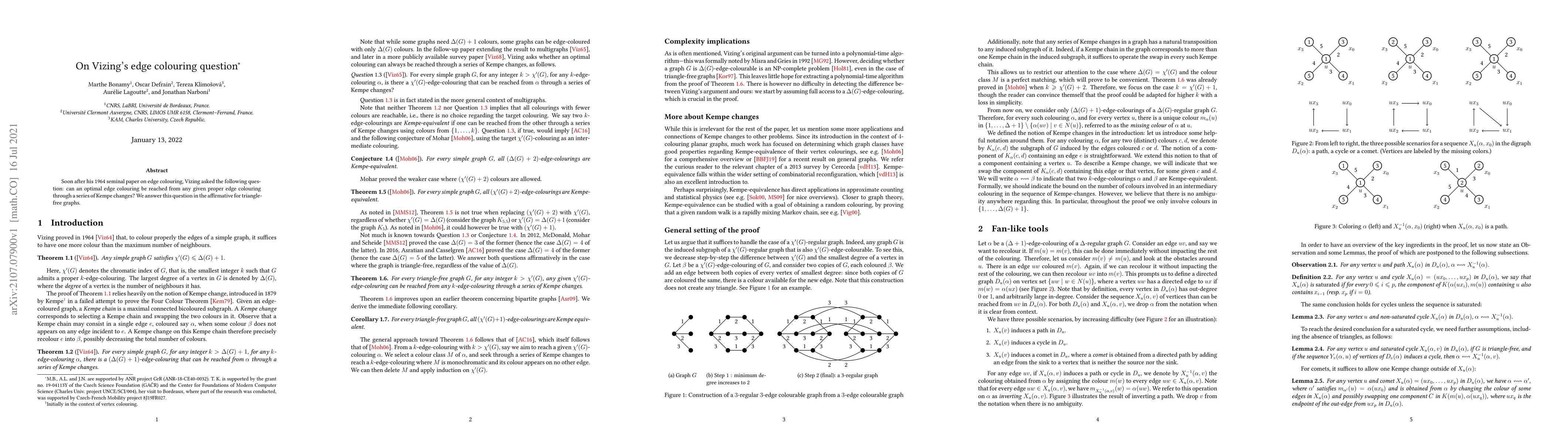 Summary: The paper confirms that an optimal edge colouring can be achieved from any given proper edge colouring via a series of Kempe changes for triangle-free graphs, answering Vizing's question posed in 1964. This result applies specifically to graphs without triangles.